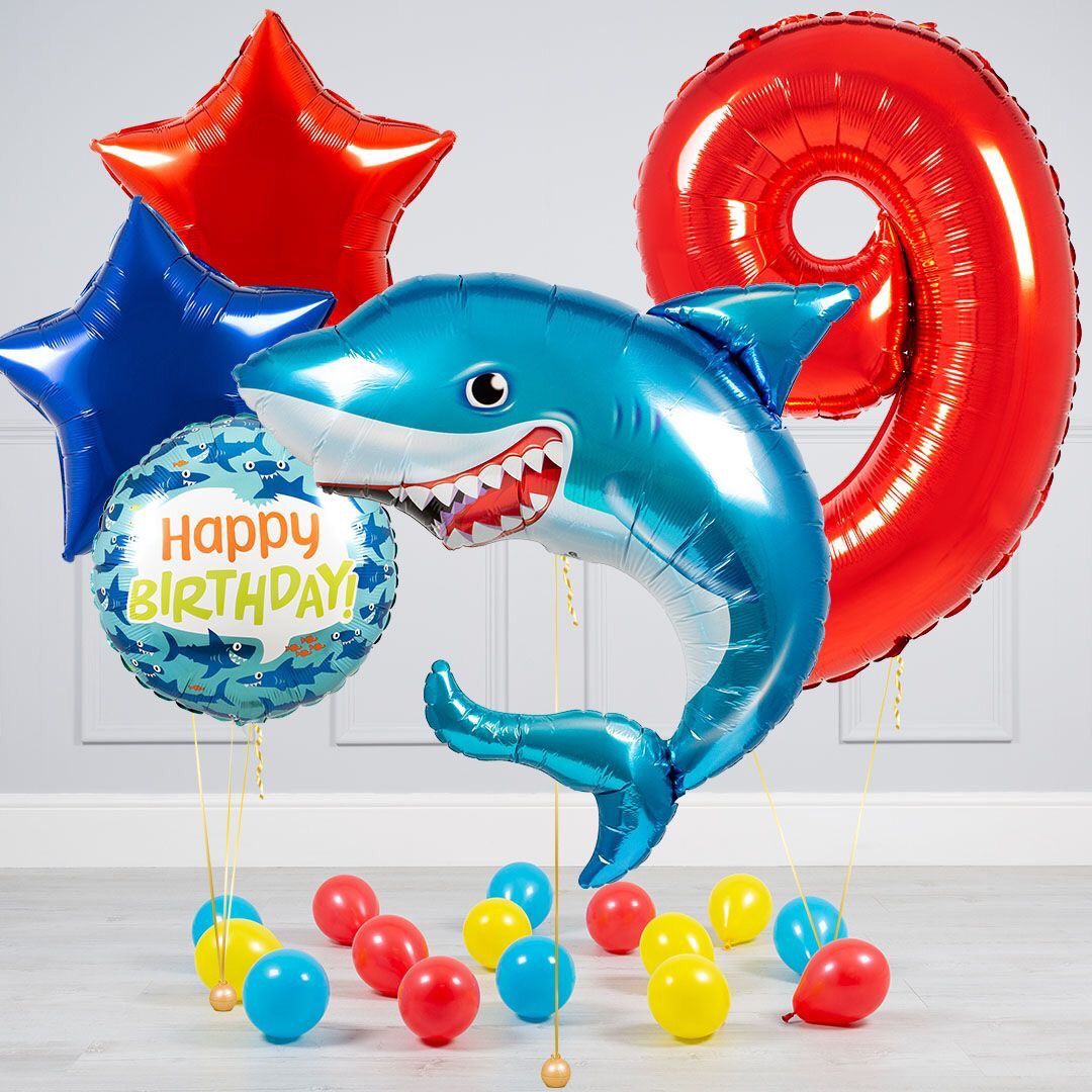 English: Combo helium balloon 198k now only 112k. Including: 1 big shark+ 1 small number + 2 medium stars+ 20 latex balloons+ tape+ ribbon + 1 HPBD balloon