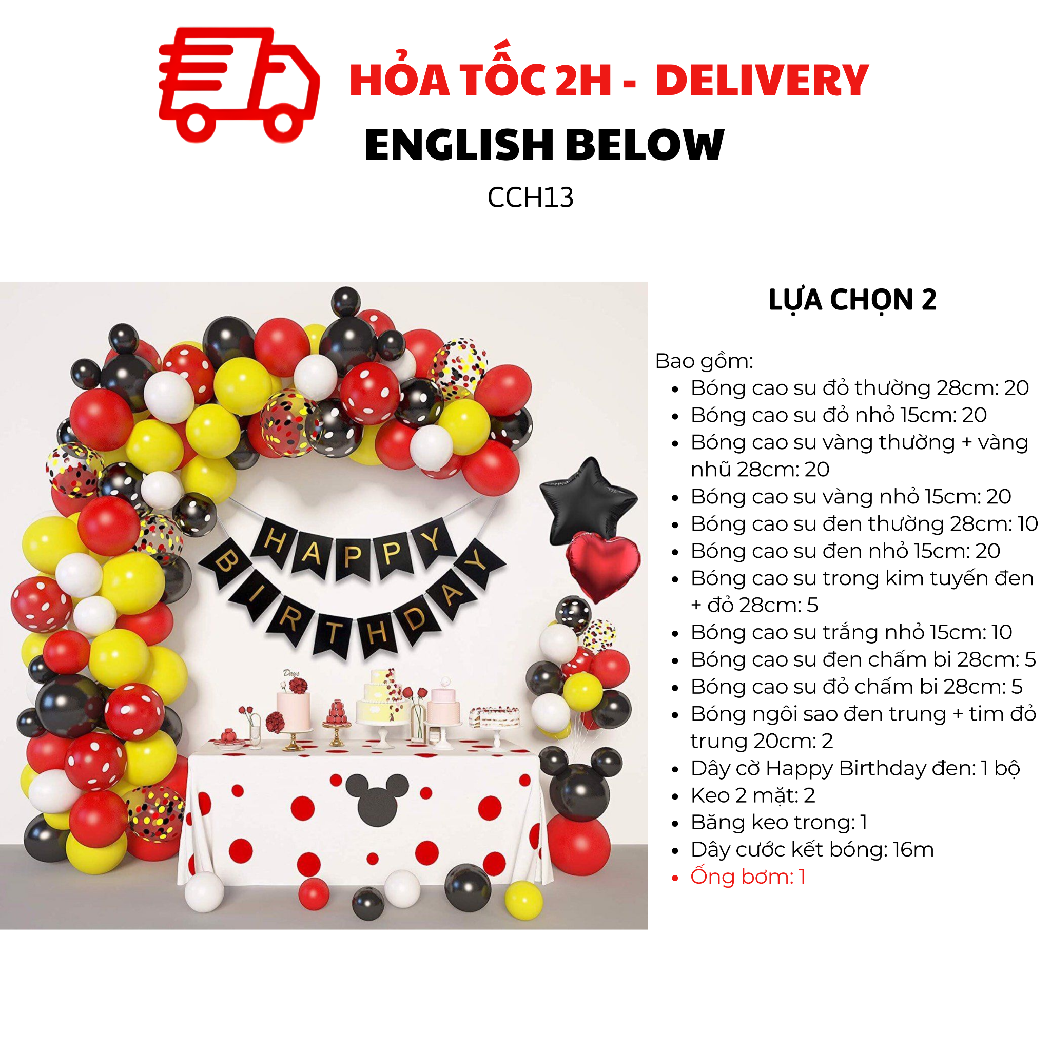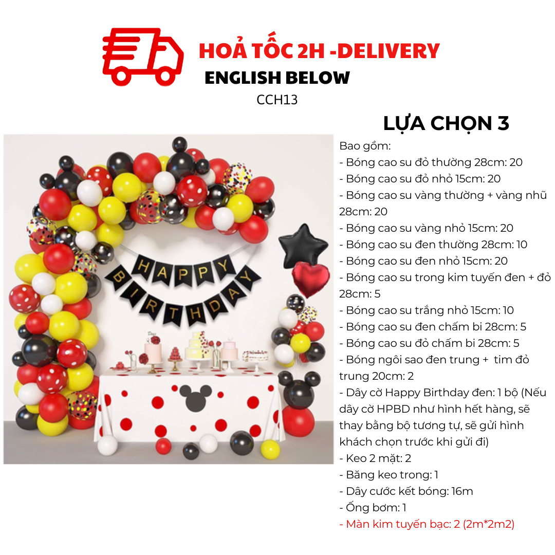 Mang không khí rộn ràng của thế giới Mickey vào bữa tiệc với bộ bong bóng trang trí siêu xinh! Bộ sản phẩm gồm bong bóng đỏ, vàng, đen chủ đạo, kết hợp cùng họa tiết chấm bi vui mắt, giúp không gian trở nên sinh động và ấn tượng.