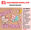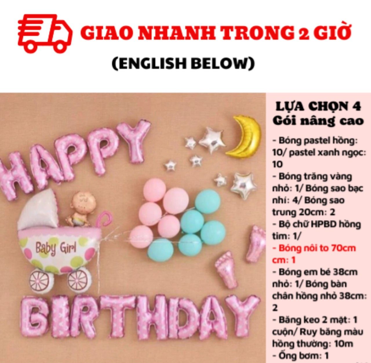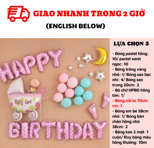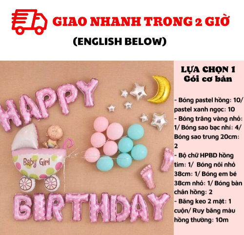 - Bộ chữ HPBD hồng tim: 1/ Bóng nôi nhỏ 38cm: 1/ Bóng em bé 38cm nhỏ: 1/ Bóng bàn chân hồng: 2