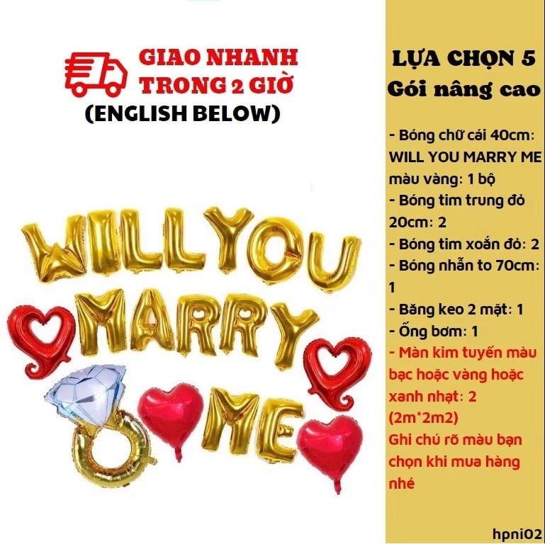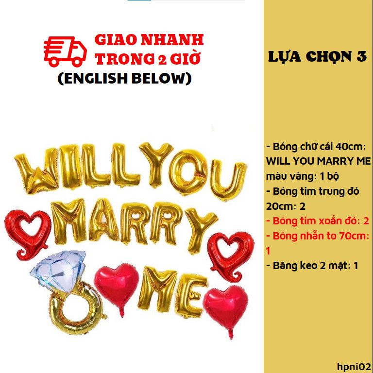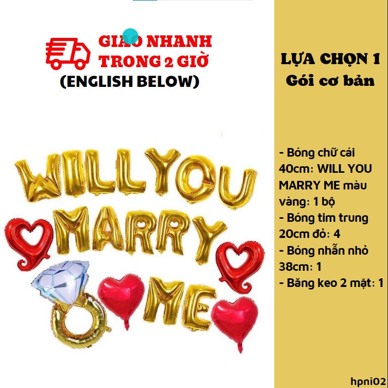 1. Bóng chữ cái 40cm: WILL YOU MARRY ME màu vàng: 1 bộ