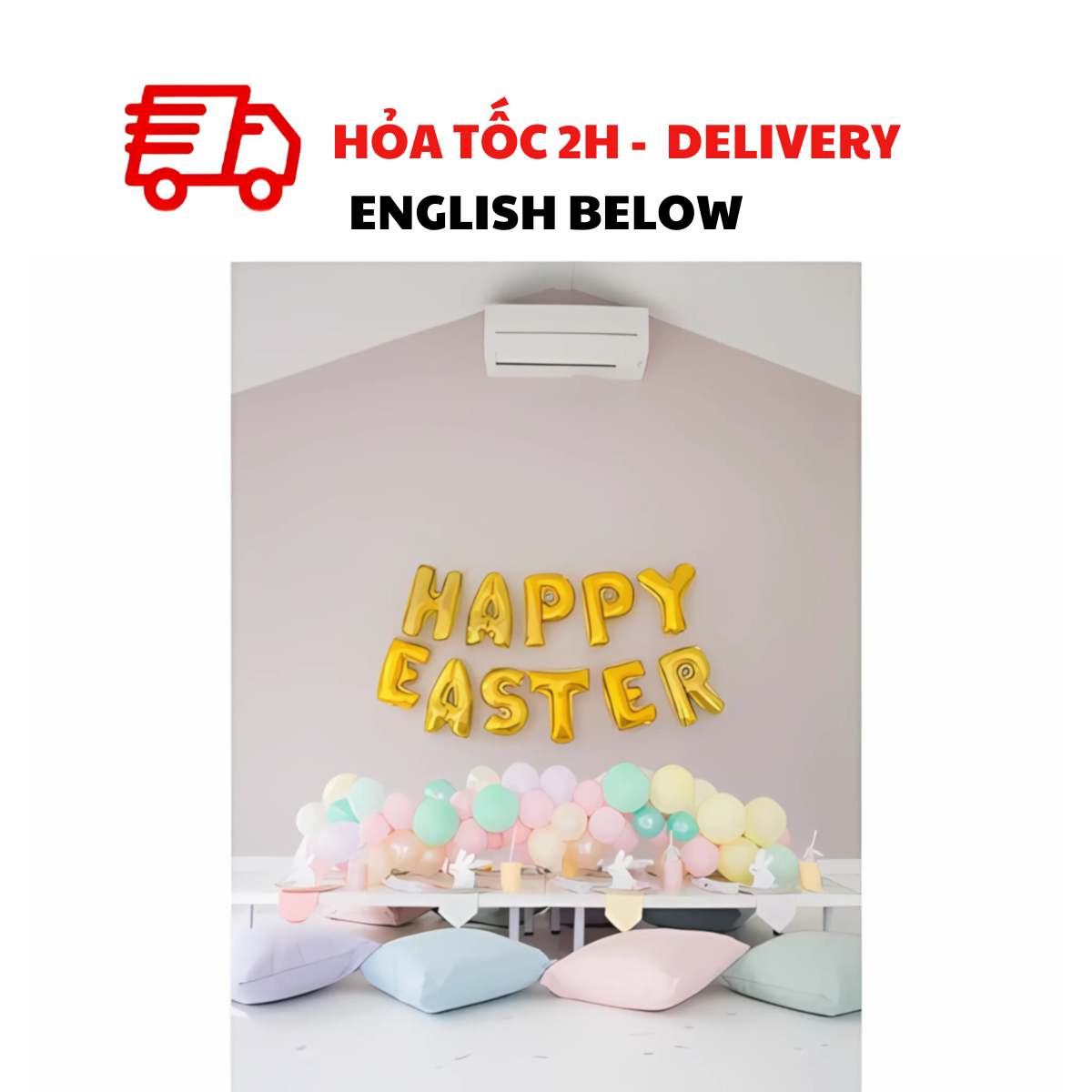 BỘ BÓNG CHỮ HAPPY EASTER MÀU VÀNG VÀ BÓNG CAO SU PASTEL TRANG TRÍ LỄ PHỤC SINH LPS01