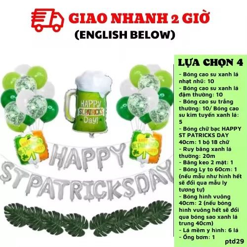 1. Bóng cao su xanh lá nhạt nhũ: 102. Bóng cao su xanh lá đậm thường: 103. Bóng cao su trắng thường: 10/ Bóng cao su kim tuyến xanh lá: 54. Bóng chữ bạc HAPPY ST PATRICKS DAY 40cm: 1 bộ 18 chữ 5. Ruy băng xanh lá thường: 20m6: Băng keo 2 mặt: 1- Bóng chai nhỏ 38cm: 1 (nếu mẫu như hình hết sẽ đổi qua mẫu ly tương tự)- Bóng hình vuông 20cm: 2 (nếu bóng hình vuông hết sẽ đổi qua bóng sao xanh lá trung 20cm)- Ống bơm