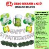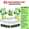1. Bóng cao su xanh lá nhạt nhũ: 102. Bóng cao su xanh lá đậm thường: 103. Bóng cao su trắng thường: 10/ Bóng cao su kim tuyến xanh lá: 54. Bóng chữ bạc HAPPY ST PATRICKS DAY 40cm: 1 bộ 18 chữ 5. Ruy băng xanh lá thường: 20m6: Băng keo 2 mặt: 1- Bóng Ly to 60cm: 1 (nếu mẫu như hình hết sẽ đổi qua mẫu ly tương tự)- Bóng hình vuông 40cm: 2 (nếu bóng hình vuông hết sẽ đổi qua bóng sao xanh lá trung 40cm)- Lá mềm y hình: 6 lá - Ống bơm: 1