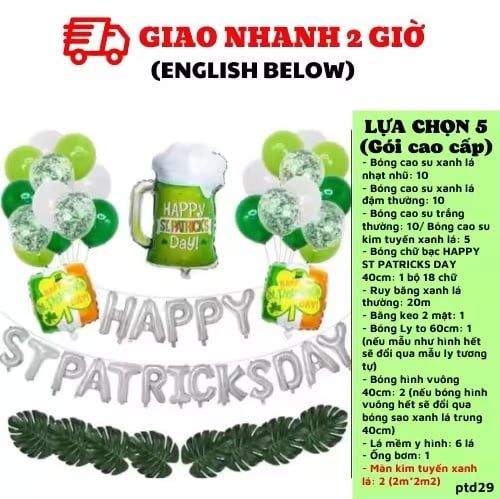 1. Bóng cao su xanh lá nhạt nhũ: 102. Bóng cao su xanh lá đậm thường: 103. Bóng cao su trắng thường: 10/ Bóng cao su kim tuyến xanh lá: 54. Bóng chữ bạc HAPPY ST PATRICKS DAY 40cm: 1 bộ 18 chữ 5. Ruy băng xanh lá thường: 20m6: Băng keo 2 mặt: 1- Bóng Ly to 60cm: 1 (nếu mẫu như hình hết sẽ đổi qua mẫu ly tương tự)- Bóng hình vuông 40cm: 2 (nếu bóng hình vuông hết sẽ đổi qua bóng sao xanh lá trung 40cm)- Lá mềm y hình: 6 lá - Ống bơm: 1- Màn kim tuyến xanh lá: 2 (2m*2m2)