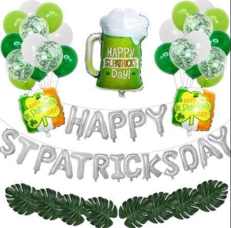 Include:- Light green normal balloons: 10- Dark green normal balloons: 10/ White balloons: 10- Green confetti balloons:5- 40cm silver ‘HAPPY ST PATRICKS DAY’ foil balloons: 1set- Green ribbons: 20m- Tape: 1/ Foil square balloon 40cm as photo: 2 (if this run out we will change to green star balloons)- Green leaves: 6pcs- Handpump: 1- Foil balloon glasses as photo 60cm: 1 (if this design run out we will change to another similar)- Foil curtain: 2
