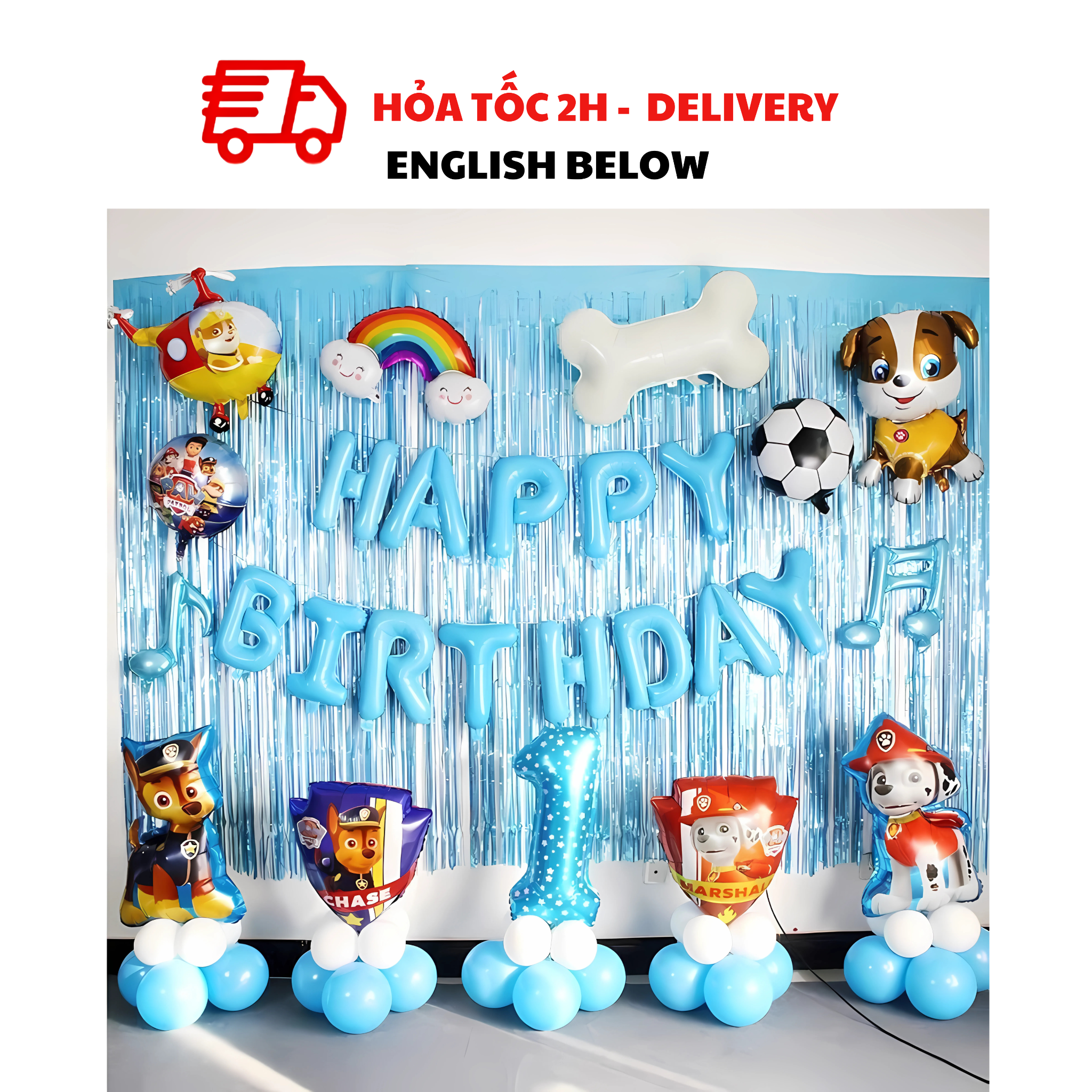 Mang đến bữa tiệc sinh nhật lung linh với bộ bóng Paw Patrol màu xanh cực dễ thương! Thiết kế ấn tượng với backdrop rèm kim tuyến, bóng chữ HAPPY BIRTHDAY và loạt nhân vật quen thuộc như Chase, Marshall,...