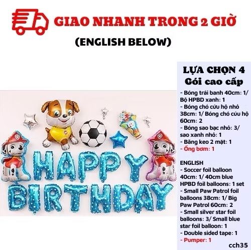 40cm blue HPBD foil balloons: 1 set- Small Paw Patrol foil balloons 38cm: 1/ Big Paw Patrol 60cm: 2