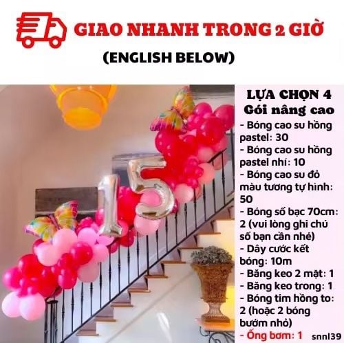 LỰA CHỌN 3: NHƯ LỰA CHỌN 1 NHƯNG BÓNG SỐ UPSIZE TOCombo có giá: 420KNay chỉ còn: 274KBao gồm: - Bóng cao su hồng pastel: 30/ hồng pastel nhí: 10- Bóng cao su đỏ màu tương tự hình: 50- Bóng số bạc 70cm: 2 (vui lòng ghi chú số bạn cần nhé)- Dây cước kết bóng: 10m- Băng keo 2 mặt: 1/ Băng keo trong: 1- Bóng tim hồng to: 2 (hoặc 2 bóng bướm nhỏ)LỰA CHỌN 4: GÓI NÂNG CAO. BAO GỒM LỰA CHỌN 3 VÀ ỐNG BƠMCombo có giá: 465KNay chỉ còn: 303KBao gồm: - Bóng cao su hồng pastel: 30/ hồng pastel nhí: 10- Bóng cao su đỏ màu tương tự hình: 50- Bóng số bạc 70cm: 2 (vui lòng ghi chú số bạn cần nhé)- Dây cước kết bóng: 10m- Băng keo 2 mặt: 1/ Băng keo trong: 1- Bóng tim hồng to: 2 (hoặc 2 bóng bướm nhỏ)- Ống bơm: 1