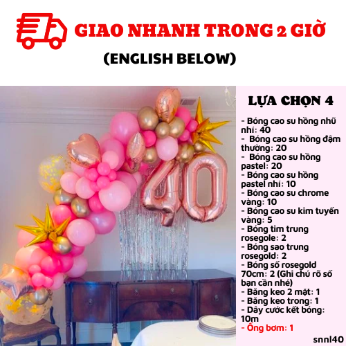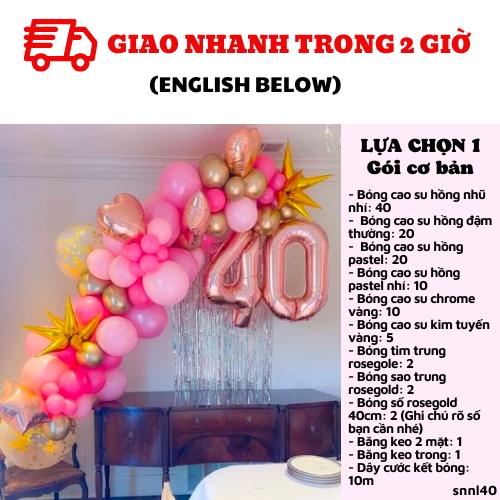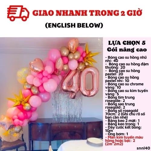 Bao gồm: - Bóng cao su hồng nhũ nhí: 40+ hồng đậm thường: 20+ hồng pastel: 20+ hồng pastel nhí: 10- Bóng cao su chrome vàng: 10/ Bóng cao su kim tuyến vàng: 5- Bóng tim trung rosegole: 2/ sao trung rosegold: 2- Bóng số rosegold 70cm: 2 (Ghi chú rõ số bạn cần nhé)- Băng keo 2 mặt: 1/ Băng keo trong: 1/ Dây cước kết bóng: 10m- Ống bơm: 1LỰA CHỌN 5: GÓI NÂNG CAO. BAO GỒM LỰA CHỌN 4+MÀN KIM TUYẾNCombo có giá: 780KNay chỉ còn: 499K