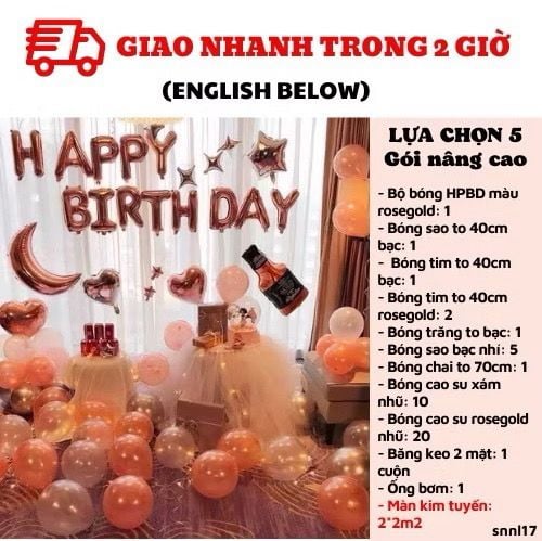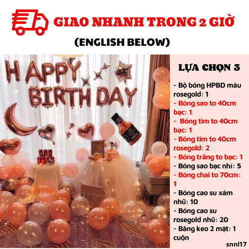 2. Bóng sao to 40cm bạc: 1+ tim to 40cm bạc: 1+ tim to 40cm rosegold: 2+ Trăng to bạc: 1+ sao bạc nhí: 5