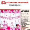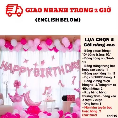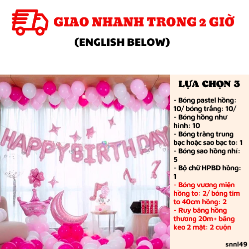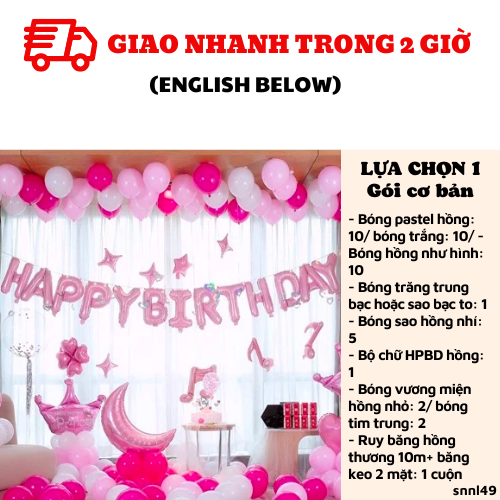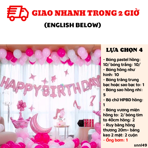Bao gồm: - Bóng pastel hồng: 10/ bóng trắng: 10/ Bóng hồng như hình: 10- Bóng trăng trung bạc hoặc sao bạc to: 1- Bóng sao hồng nhí: 5- Bộ chữ HPBD hồng: 1- Bóng vương miện hồng nhỏ: 2/ bóng tim trung: 2- Ruy băng hồng thương 10m+ băng keo 2 mặt: 1 cuộnLỰA CHỌN 2: BAO GỒM GÓI CƠ BẢN+ ỐNG BƠMCombo có giá: 401kNay chỉ còn: 258k