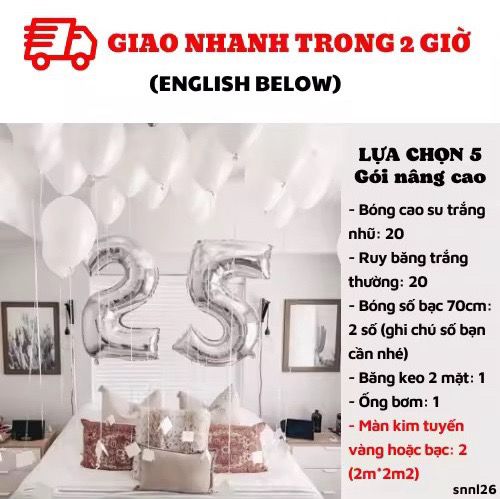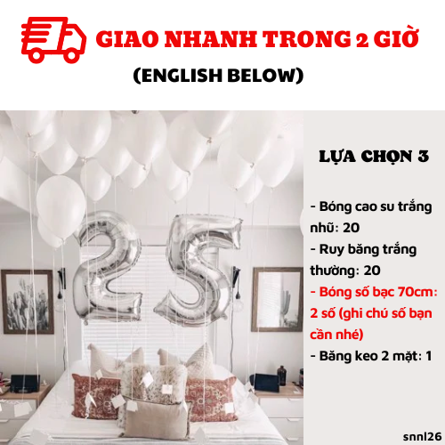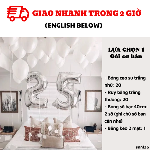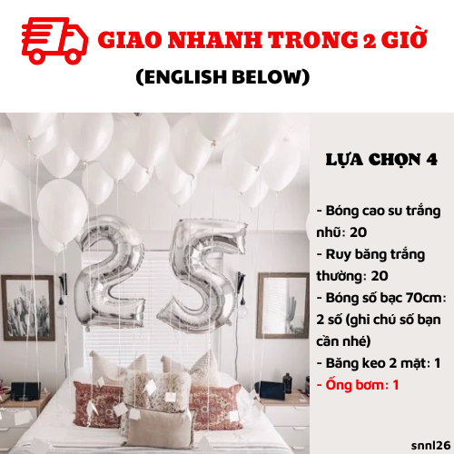 LỰA CHỌN 3: đổi bóng số nhỏ qua số to 70cmCombo có giá: 208kNay chỉ còn: 135kBao gồm:- Bóng cao su trắng nhũ: 20- Ruy băng trắng thường: 20- Bóng số bạc 70cm: 2 số (ghi chú số bạn cần nhé)- Băng keo 2 mặt: 1LỰA CHỌN 4: BAO GỒM LỰA CHỌN 3+ ỐNG BƠMCombo có giá: 253KNay chỉ còn: 164KBao gồm:- Bóng cao su trắng nhũ: 20- Ruy băng trắng thường: 20- Bóng số bạc 70cm: 2 số (ghi chú số bạn cần nhé)- Băng keo 2 mặt: 1- Ống bơm: 1