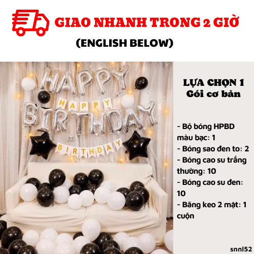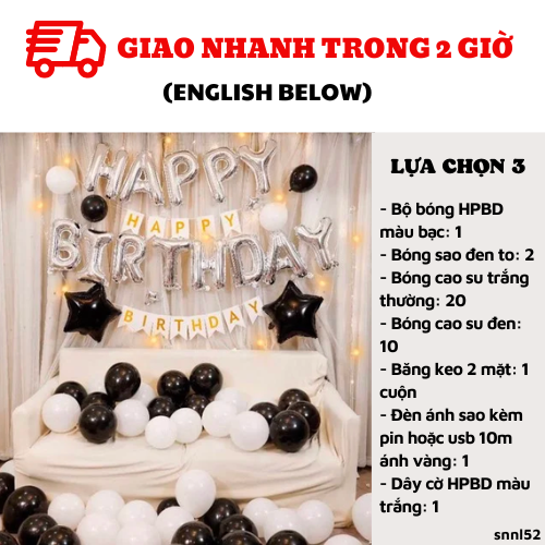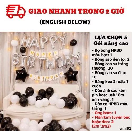 Bao gồm: - Bộ bóng HPBD màu bạc: 1/ Bóng sao đen to: 2- Bóng cao su trắng thường: 20/ Bóng cao su đen: 10/ Băng keo 2 mặt: 1 cuộn- Đèn ánh sao kèm pin hoặc usb 10m ánh vàng: 1/ Dây cờ HPBD màu trắng: 1- Ống bơm: 1- Màn kim tuyến bạc hoặc đen: 2 (2m*2m2)