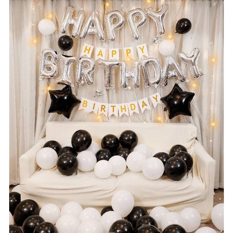 Bao gồm: - Bộ bóng HPBD màu bạc: 1/ Bóng sao đen to: 2- Bóng cao su trắng thường: 20/ Bóng cao su đen: 10/ Băng keo 2 mặt: 1 cuộn- Đèn ánh sao kèm pin hoặc usb 10m ánh vàng: 1/ Dây cờ HPBD màu trắng: 1