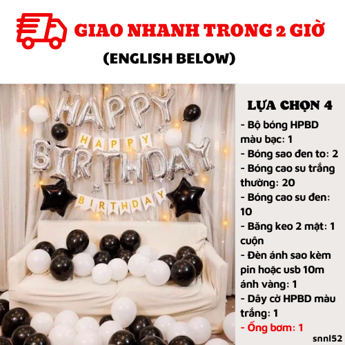 LỰA CHỌN 4: Bao gồm lựa chọn 3 + ống bơmCombo có giá: 585kNay chỉ còn: 387kBao gồm: - Bộ bóng HPBD màu bạc: 1/ Bóng sao đen to: 2- Bóng cao su trắng thường: 20/ Bóng cao su đen: 10/ Băng keo 2 mặt: 1 cuộn- Đèn ánh sao kèm pin hoặc usb 10m ánh vàng: 1/ Dây cờ HPBD màu trắng: 1- Ống bơm: 1