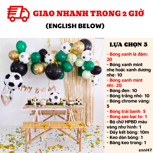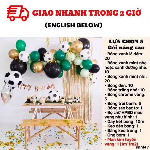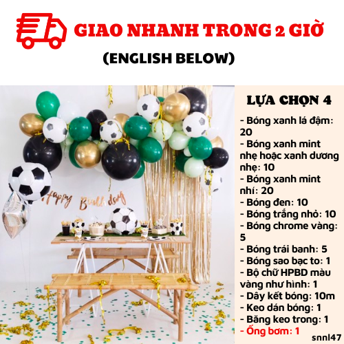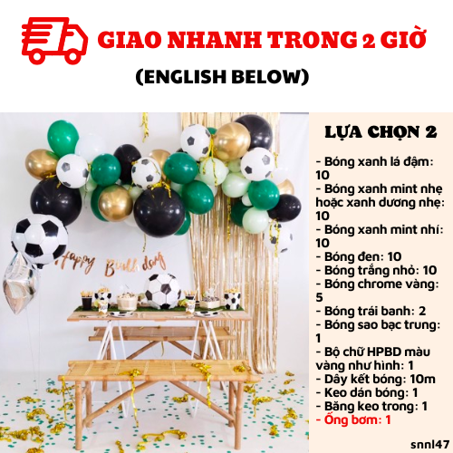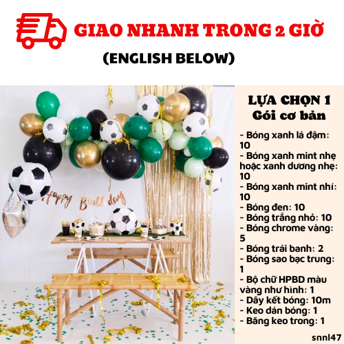 Bao gồm: (số bóng đủ kết 1.5-2m như hình)- Bóng xanh lá đậm: 10/ Bóng xanh mint nhẹ hoặc xanh dương nhẹ: 10/ Bóng xanh mint nhí: 10- Bóng đen: 10/ bóng trắng nhỏ: 10/ bóng chrome vàng: 5- Bóng trái banh: 2/ Bóng sao bạc trung: 1- Bộ chữ HPBD màu vàng như hình: 1- Dây kết bóng: 10m- Keo dán bóng: 1/ Băng keo trong: 1LỰA CHỌN 2: GÓI CƠ BẢN+ ỐNG BƠMCombo có giá: 393KNay chỉ còn: 252KBao gồm: (số bóng đủ kết 1.5-2m như hình)- Bóng xanh lá đậm: 10/ Bóng xanh mint nhẹ hoặc xanh dương nhẹ: 10/ Bóng xanh mint nhí: 10- Bóng đen: 10/ bóng trắng nhỏ: 10/ bóng chrome vàng: 5- Bóng trái banh: 2/ Bóng sao bạc trung: 1- Bộ chữ HPBD màu vàng như hình: 1- Dây kết bóng: 10m- Keo dán bóng: 1/ Băng keo trong: 1- Ống bơm: 1