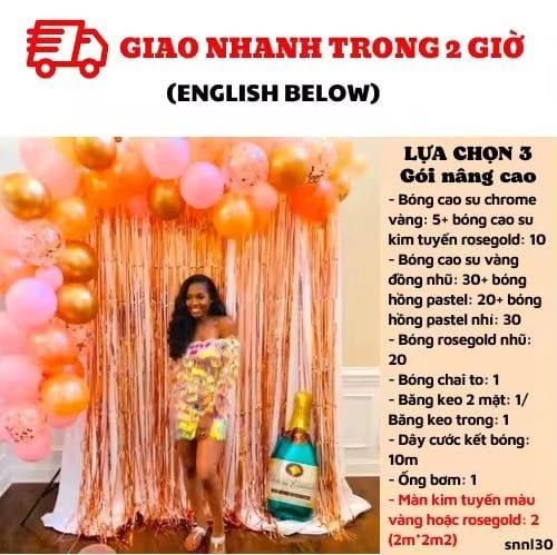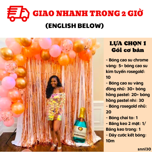 Bao gồm: (đủ kết 3m bóng như hình)- Bóng cao su chrome vàng: 5+ bóng cao su kim tuyến rosegold: 10- Bóng cao su vàng đồng nhũ: 30+ bóng hồng pastel: 20+ bóng hồng pastel nhí: 30- Bóng rosegold nhũ: 20- Bóng chai to: 1- Băng keo 2 mặt: 1/ Băng keo trong: 1- Dây cước kết bóng: 10mLỰA CHỌN 2: Bao gồm lựa chọn 1+ ống bơmCombo có giá: 500kNay chỉ còn: 328kBao gồm:- Bóng cao su chrome vàng: 5+ bóng cao su kim tuyến rosegold: 10- Bóng cao su vàng đồng nhũ: 30+ bóng hồng pastel: 20+ bóng hồng pastel nhí: 30- Bóng rosegold nhũ: 20- Bóng chai to: 1- Băng keo 2 mặt: 1/ Băng keo trong: 1- Dây cước kết bóng: 10m- Ống bơm: 1LỰA CHỌN 3: GÓI NÂNG CAO. Bao gồm lựa chọn 2+ màn kim tuyếnCombo có giá: 740kNay chỉ còn: 561kBao gồm:- Bóng cao su chrome vàng: 5+ bóng cao su kim tuyến rosegold: 10- Bóng cao su vàng đồng nhũ: 30+ bóng hồng pastel: 20+ bóng hồng pastel nhí: 30- Bóng rosegold nhũ: 20- Bóng chai to: 1- Băng keo 2 mặt: 1/ Băng keo trong: 1- Dây cước kết bóng: 10m- Ống bơm: 1- Màn kim tuyến màu vàng hoặc rosegold: 2 (2m*2m2)Vui lòng ghi chú màu màn kim tuyến bạn cần nhé