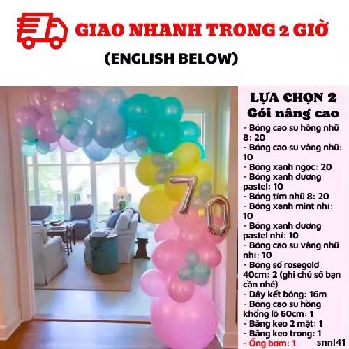 Bao gồm: (số bóng đủ kết 4m như hình)- Bóng cao su hồng nhũ 8: 20/ bóng cao su vàng nhũ: 10/ bóng xanh ngọc: 20/ bóng xanh dương pastel: 10/ bóng tím nhũ 8: 20+ bóng xanh mint nhí: 10+ xanh dương pastel nhí: 10/ Bóng cao su vàng nhũ nhí: 10- Bóng số rosegold 40cm: 2 (ghi chú số bạn cần nhé)- Dây kết bóng: 16m- Bóng cao su hồng khổng lồ 60cm: 1- Băng keo 2 mặt: 1- Băng keo trong: 1LỰA CHỌN 2: GÓI NÂNG CAO. BAO GỒM LỰA CHỌN 1 + ỐNG BƠMCombo có giá: 423KNay chỉ còn: 273K