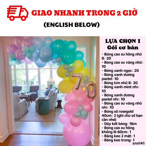 Bao gồm: (số bóng đủ kết 4m như hình)- Bóng cao su hồng nhũ 8: 20/ bóng cao su vàng nhũ: 10/ bóng xanh ngọc: 20/ bóng xanh dương pastel: 10/ bóng tím nhũ 8: 20+ bóng xanh mint nhí: 10+ xanh dương pastel nhí: 10/ Bóng cao su vàng nhũ nhí: 10- Bóng số rosegold 40cm: 2 (ghi chú số bạn cần nhé)- Dây kết bóng: 16m- Bóng cao su hồng khổng lồ 60cm: 1- Băng keo 2 mặt: 1/ Băng keo trong: 1- Ống bơm: 1