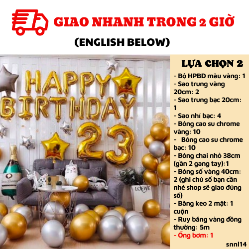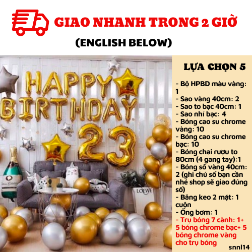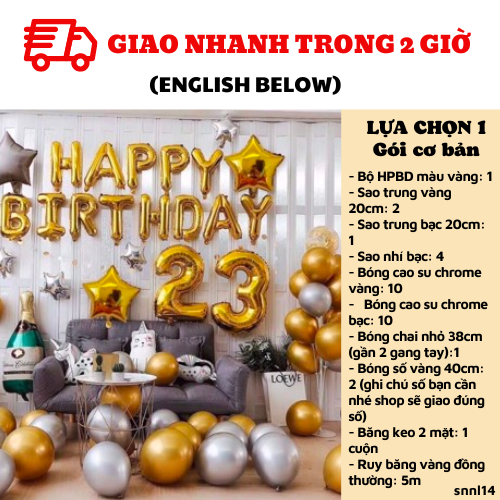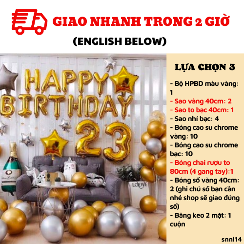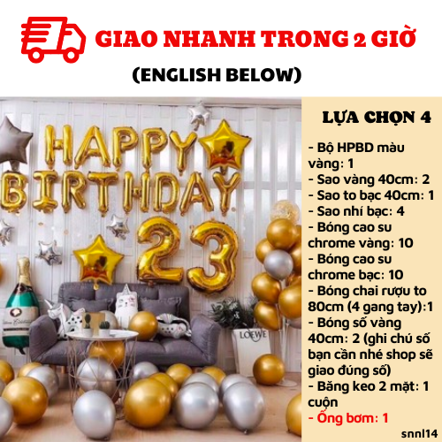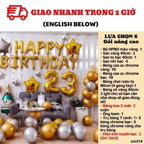 LỰA CHỌN 3: UP SIZE BÓNG LÊN SIZE TOCombo có giá: 488kNay chỉ còn: 321kBao gồm:1. Bộ HPBD màu vàng: 12. Sao vàng 40cm: 2/ Sao to bạc 40cm: 1/ Sao nhí bạc: 43. Bóng cao su chrome vàng: 10+ chrome bạc: 104. Bóng chai rượu to 80cm (4 gang tay):1+ bóng số vàng 40cm: 2 (ghi chú số bạn cần nhé shop sẽ giao đúng số)5. Băng keo 2 mặt: 1 cuộnLỰA CHỌN 4: Bao gồm lựa chọn 3+ ống bơmCombo có giá: 533kNay chỉ còn: 350kBao gồm:1. Bộ HPBD màu vàng: 12. Sao vàng 40cm: 2/ Sao to bạc 40cm: 1/ Sao nhí bạc: 43. Bóng cao su chrome vàng: 10+ chrome bạc: 104. Bóng chai rượu to 80cm (4 gang tay):1+ bóng số vàng 40cm: 2 (ghi chú số bạn cần nhé shop sẽ giao đúng số)5. Băng keo 2 mặt: 1 cuộn6. Ống bơm: 1LỰA CHỌN 5: Bao gồm lựa chọn 4+ trụ bóng kèm bóngCombo có giá: 703kNay chỉ còn: 472kBao gồm:1. Bộ HPBD màu vàng: 12. Sao vàng 40cm: 2/ Sao to bạc 40cm: 1/ Sao nhí bạc: 43. Bóng cao su chrome vàng: 10+ chrome bạc: 104. Bóng chai rượu to 80cm (4 gang tay):1+ bóng số vàng 40cm: 2 (ghi chú số bạn cần nhé shop sẽ giao đúng số)5. Băng keo 2 mặt: 1 cuộn6. Ống bơm: 17. Trụ bóng 7 cành: 1+ 5 bóng chrome bạc+ 5 bóng chrome vàng cho trụ bóngLỰA CHỌN 6: GÓI NÂNG CAO. Bao gồm lựa chọn 5 + Màn kim tuyếnCombo có giá: 943kNay chỉ còn: 630kBao gồm:1. Bộ HPBD màu vàng: 12. Sao vàng 40cm: 2/ Sao to bạc 40cm: 1/ Sao nhí bạc: 43. Bóng cao su chrome vàng: 10+ chrome bạc: 104. Bóng chai rượu to 80cm (4 gang tay):1+ bóng số vàng 40cm: 2 (ghi chú số bạn cần nhé shop sẽ giao đúng số)5. Băng keo 2 mặt: 2 cuộn6. Ống bơm: 17. Trụ bóng: 1 + 5 bóng chrome bạc+ 5 bóng chrome vàng cho trụ bóng8. Màn kim tuyến bạc: 2 (2m*2m2)