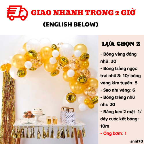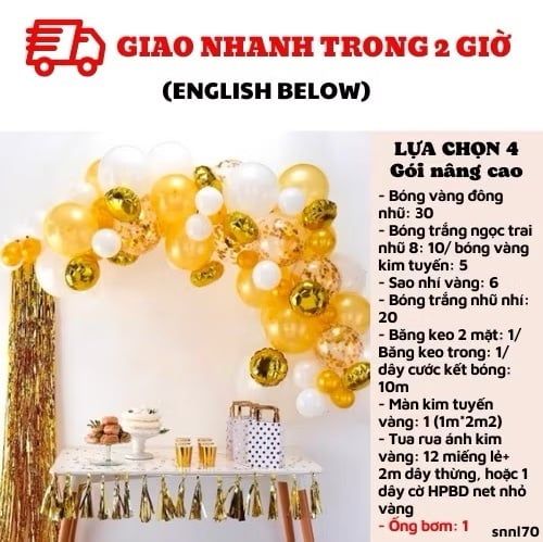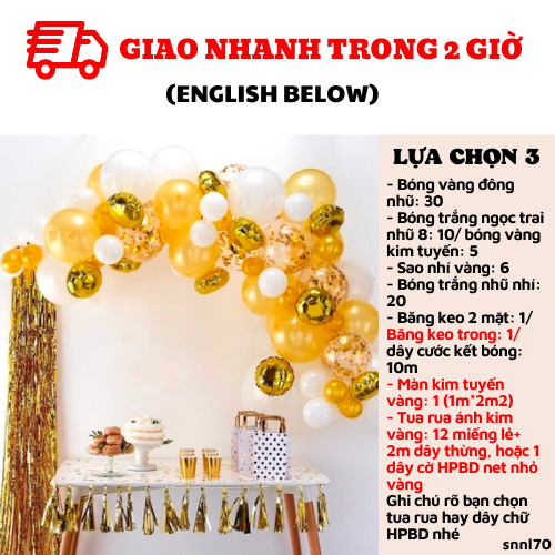 - Tua rua ánh kim vàng: 12 miếng lẻ+ 2m dây thừng, hoặc 1 dây cờ HPBD net nhỏ vàng