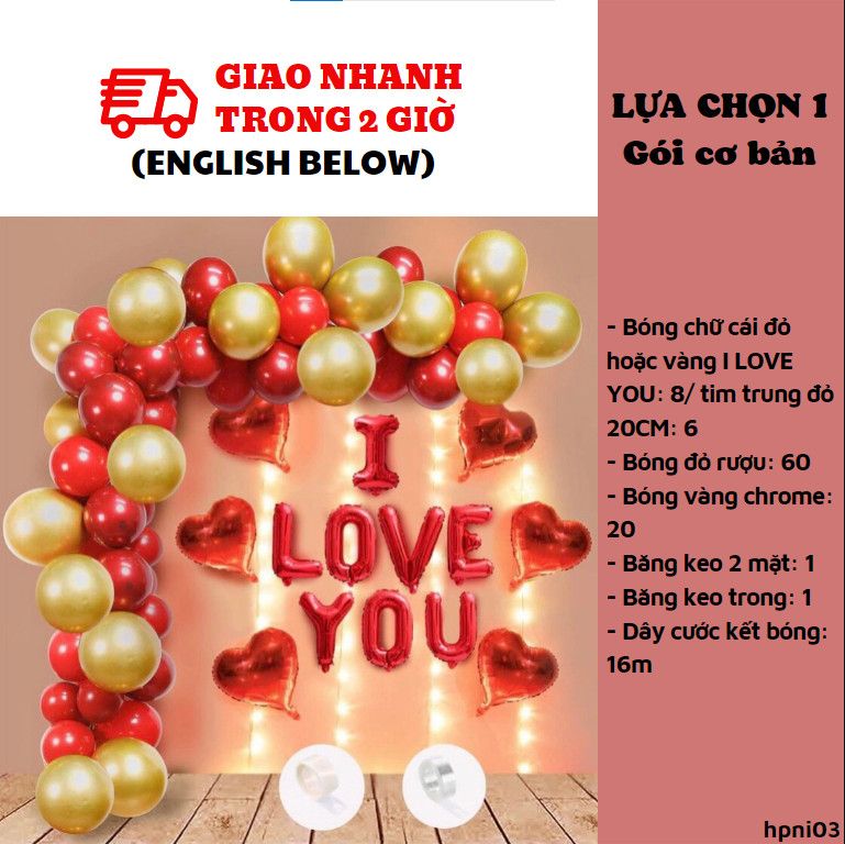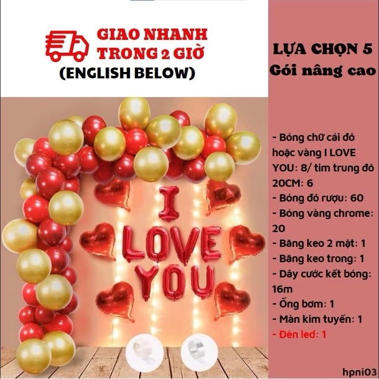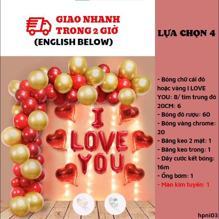 1. Bóng chữ cái đỏ hoặc vàng I LOVE YOU: 8/ tim trung đỏ 20CM: 6