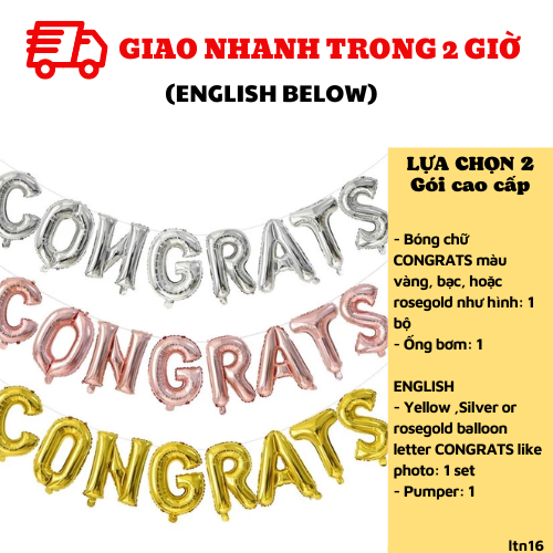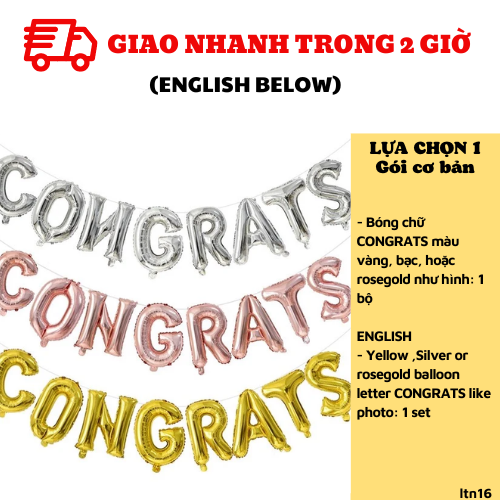 - Bóng chữ CONGRATS màu vàng, bạc, hoặc rosegold như hình: 1 bộ (ghi chú màu ban cần nhé)