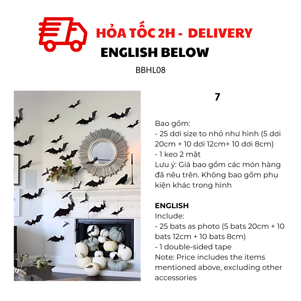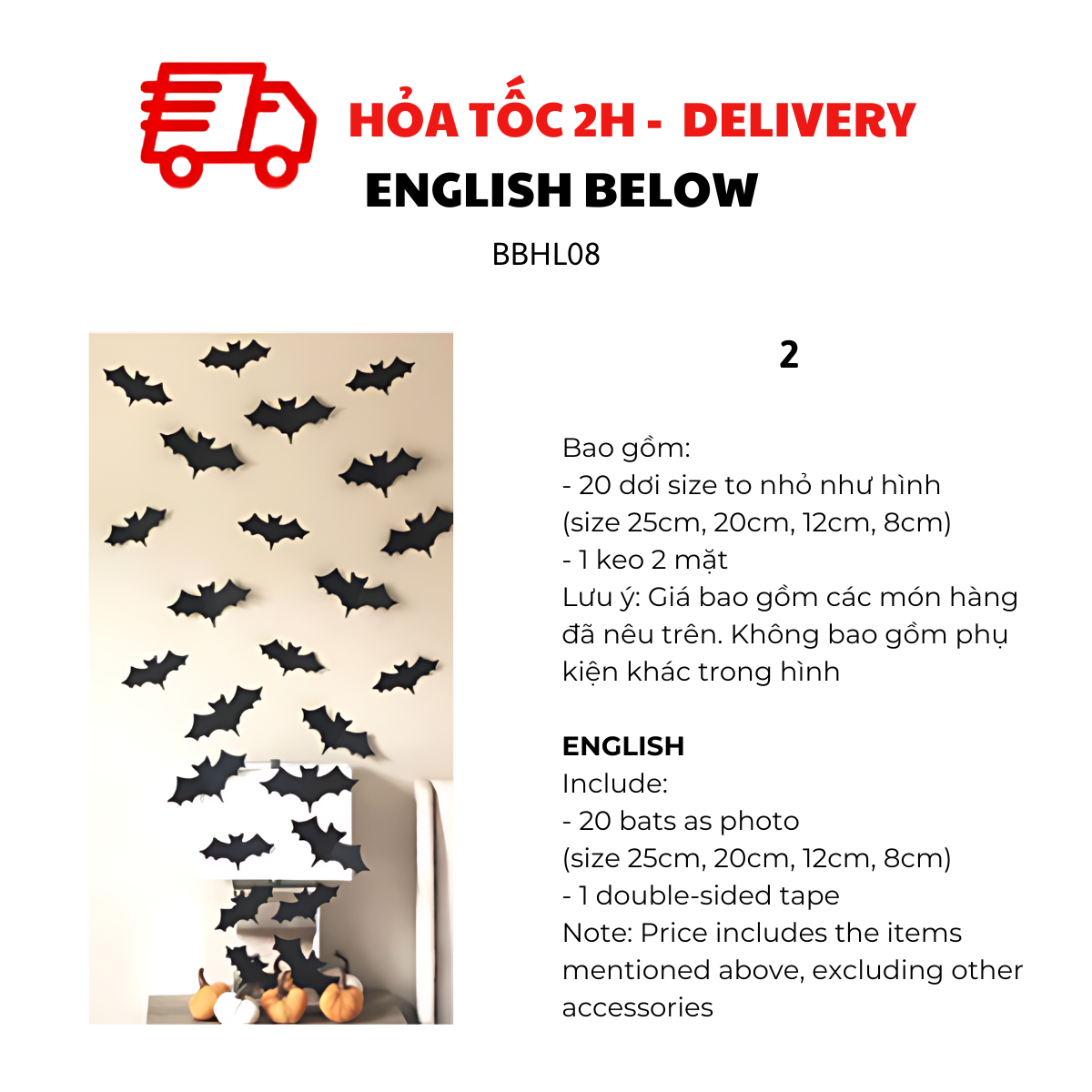 - 25 dơi size to nhỏ như hình (5 dơi 20cm + 10 dơi 12cm + 10dơi 8cm)