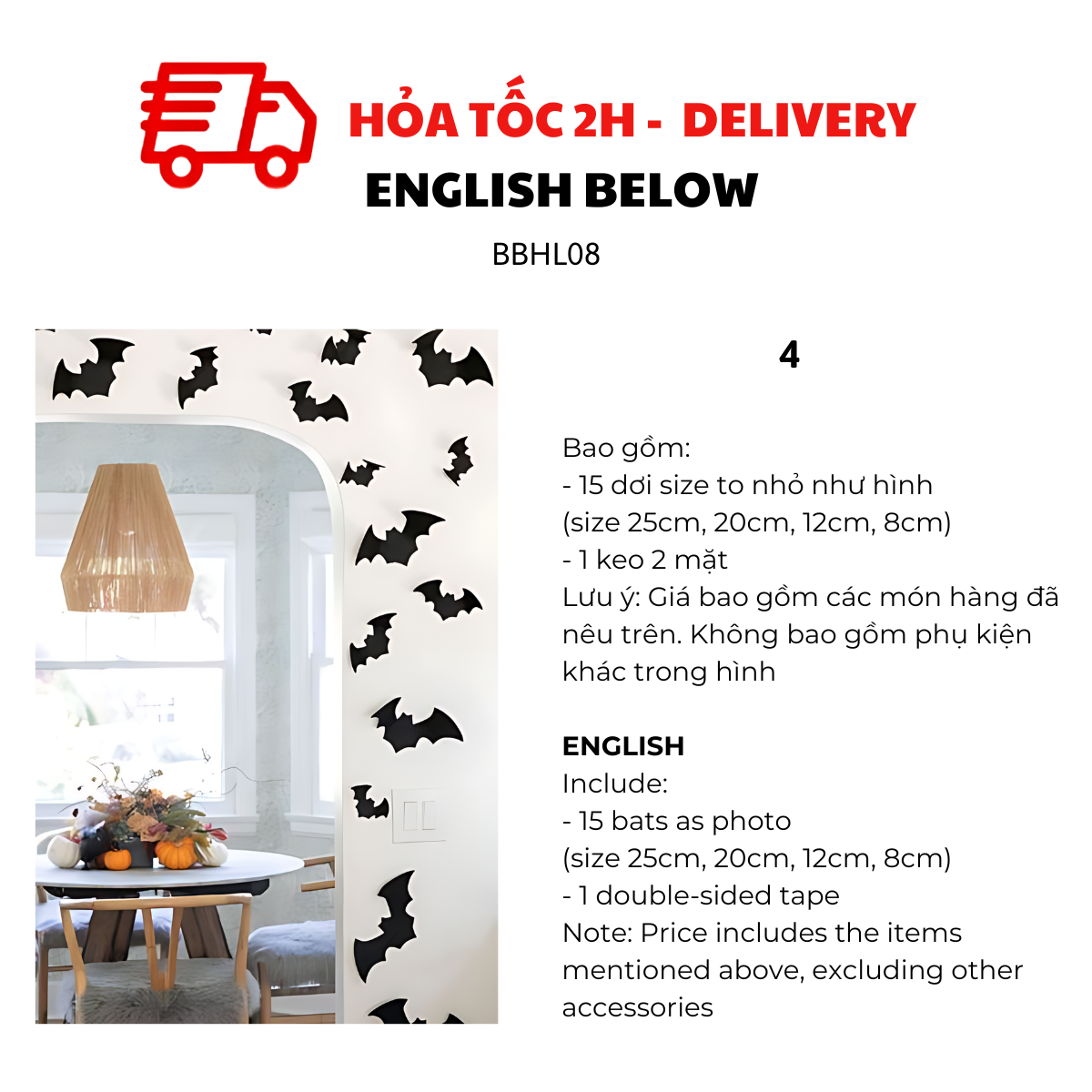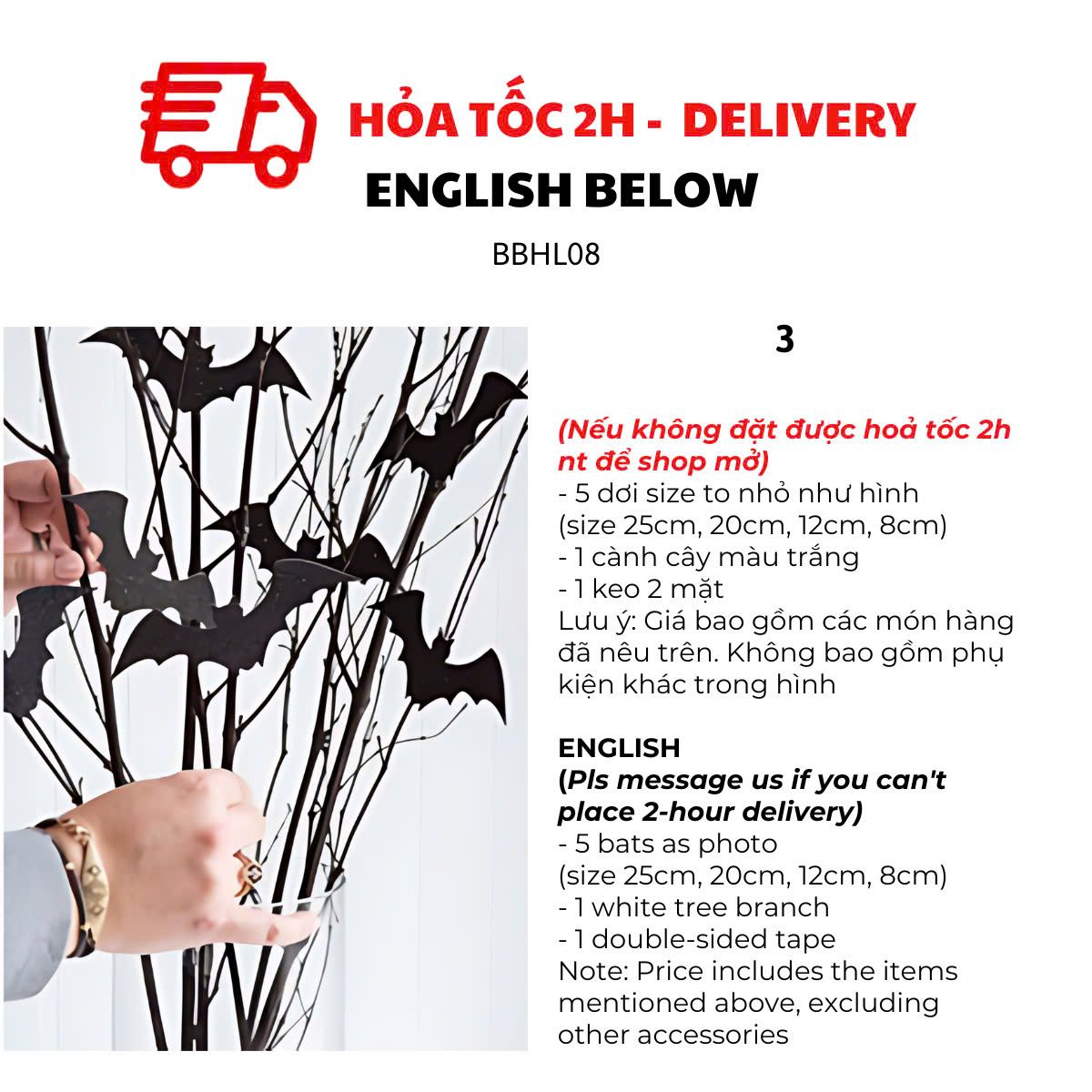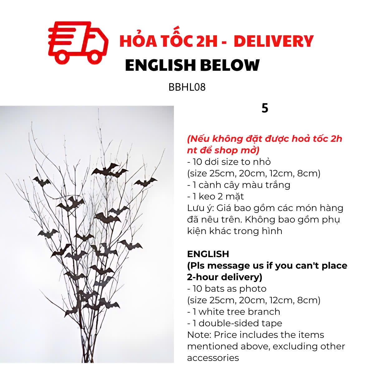 OPTION 5: 10 BATS + 1 WHITE TREE BRANCH (Please buy 2 sets if you want look like the photo)