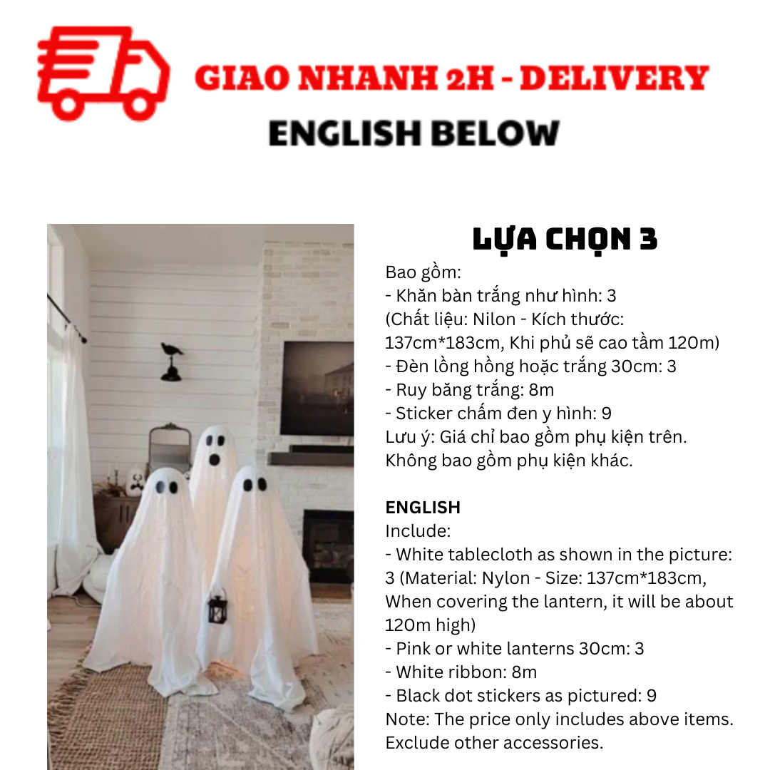 - Khăn bàn trắng như hình: 3 (Chất liệu: Nilon - Kích thước: 137cm*183cm, Khi phủ sẽ cao tầm 120m)