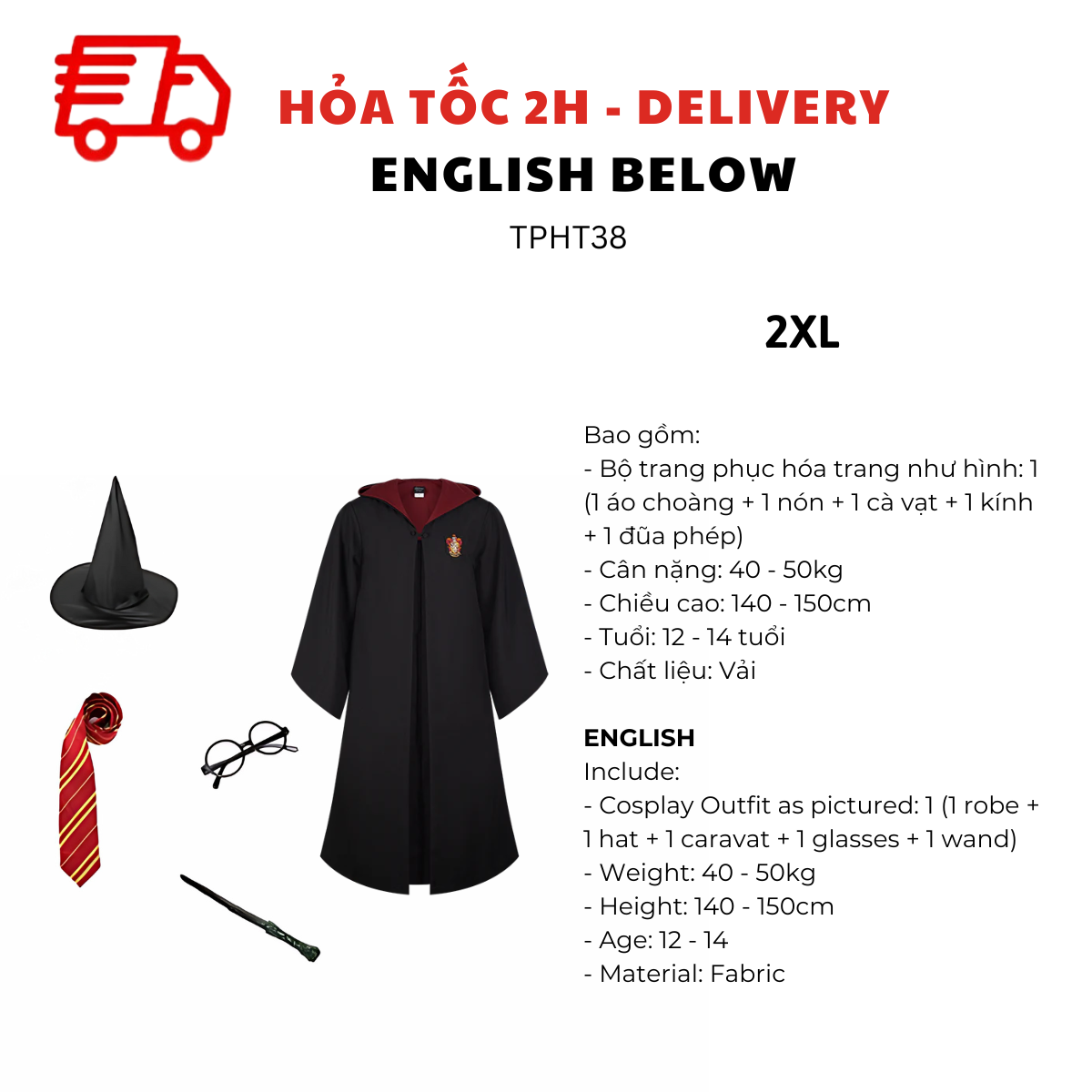 - Bộ trang phục hóa trang như hình: 1 (1 áo choàng + 1 nón + 1 cà vạt + 1 kính + 1 đũa phép)