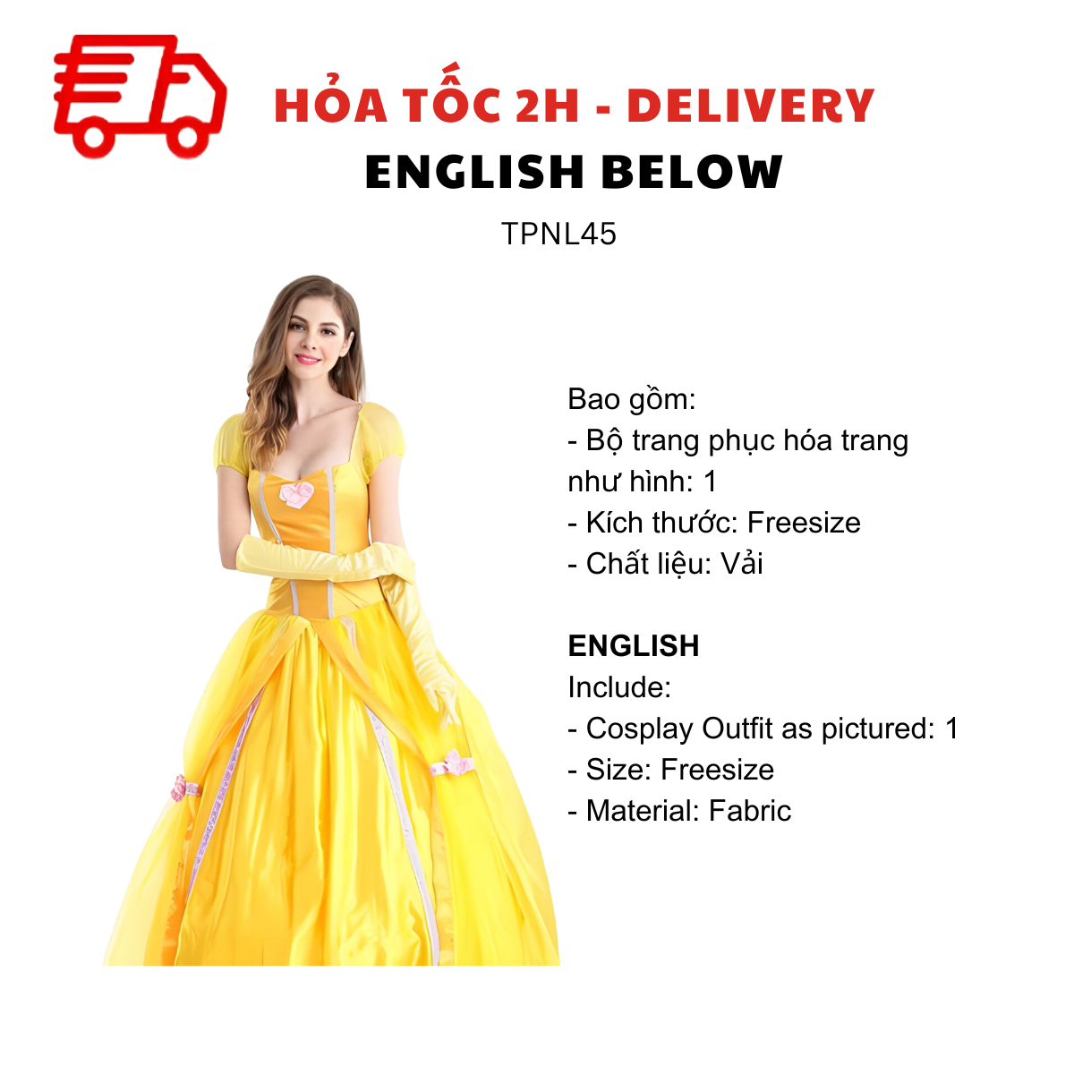 BỘ TRANG PHỤC HÓA TRANG NGƯỜI ĐẸP VÀ QUÁI VẬT CỦA DISNEY, VÁY DẠ HỘI MÀU VÀNG TPNL45