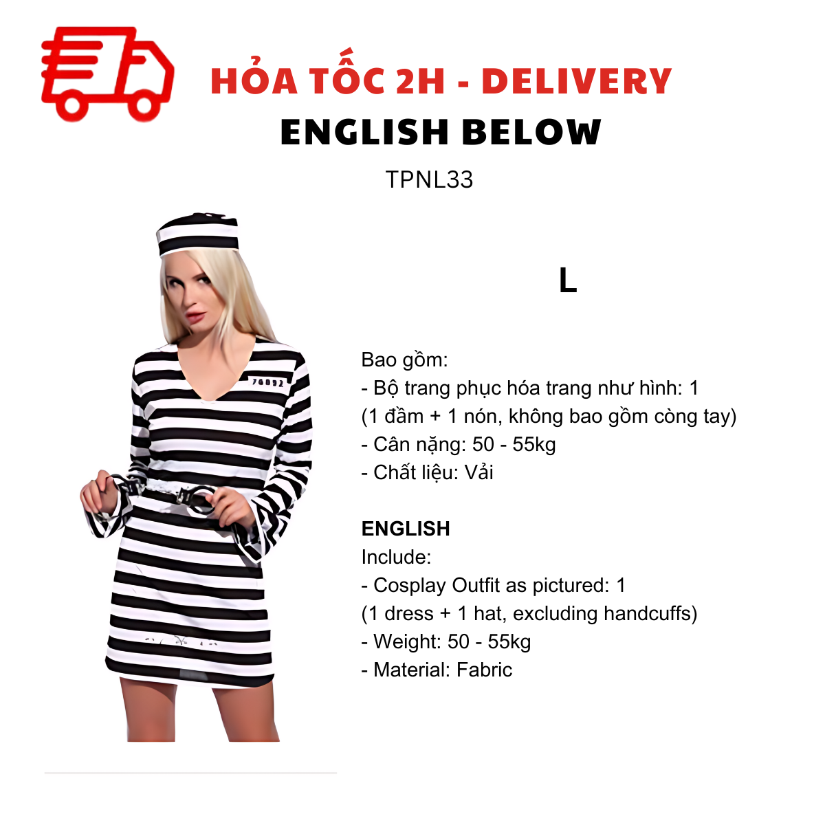 - Bộ trang phục hóa trang như hình: 1 (1 đầm + 1 nón, không bao gồm còng tay)