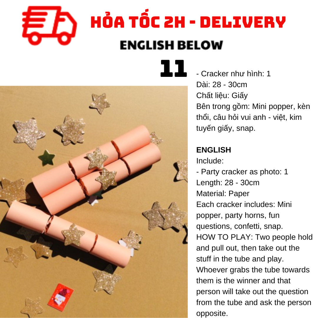 Bên trong bao gồm: Confetti, mini popper, kèn thổi, thiệp chúc nhỏ kèm câu hỏi, nón giấy
