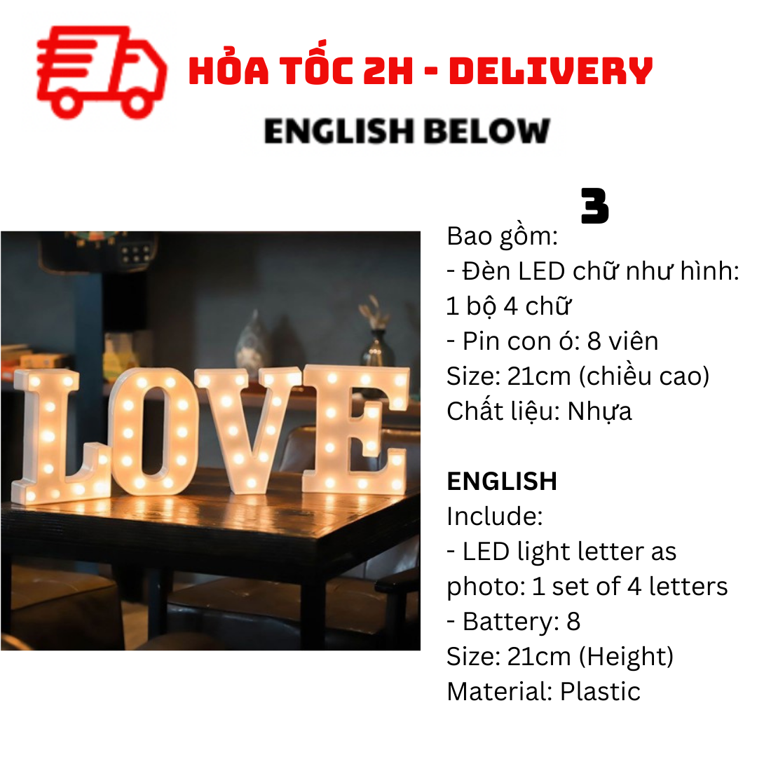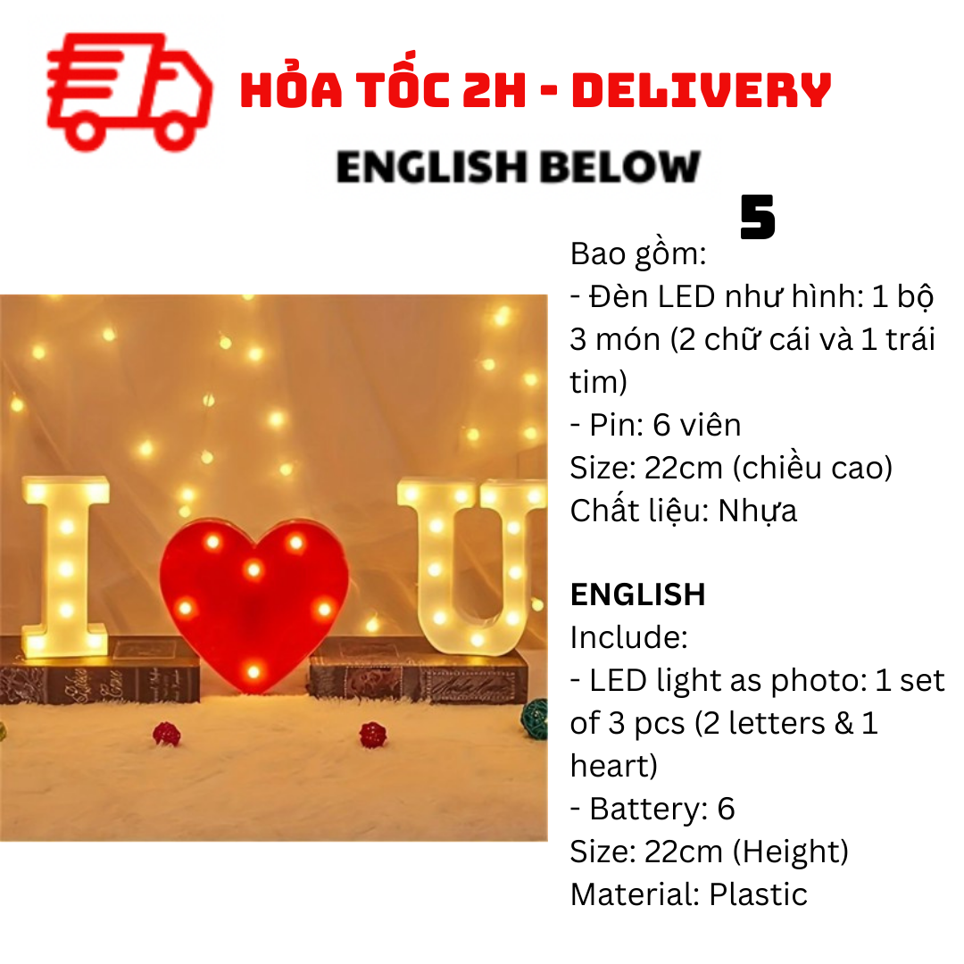 - LED light as photo: 1 set of 3 pcs (2 letters & 1 heart)