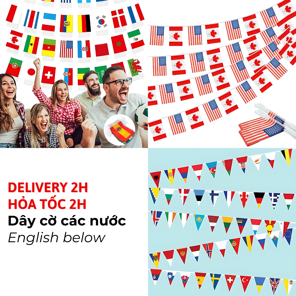 Biến buổi tiệc của bạn trở nên sinh động với dây cờ các nước trên thế giới trang trí sự kiện. Đây là phụ kiện lý tưởng cho ngày hội văn hóa, tiệc quốc tế hay chào đón sinh viên nước ngoài. Thiết kế sống động, dễ treo, giúp sự kiện thêm ấn tượng và chuyên nghiệp.