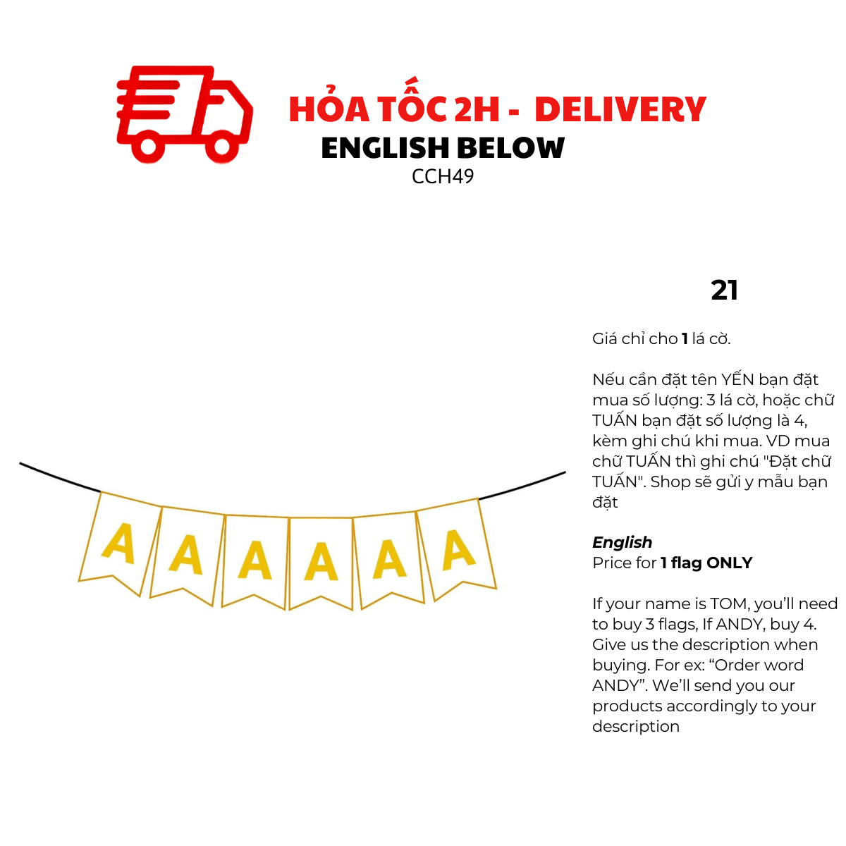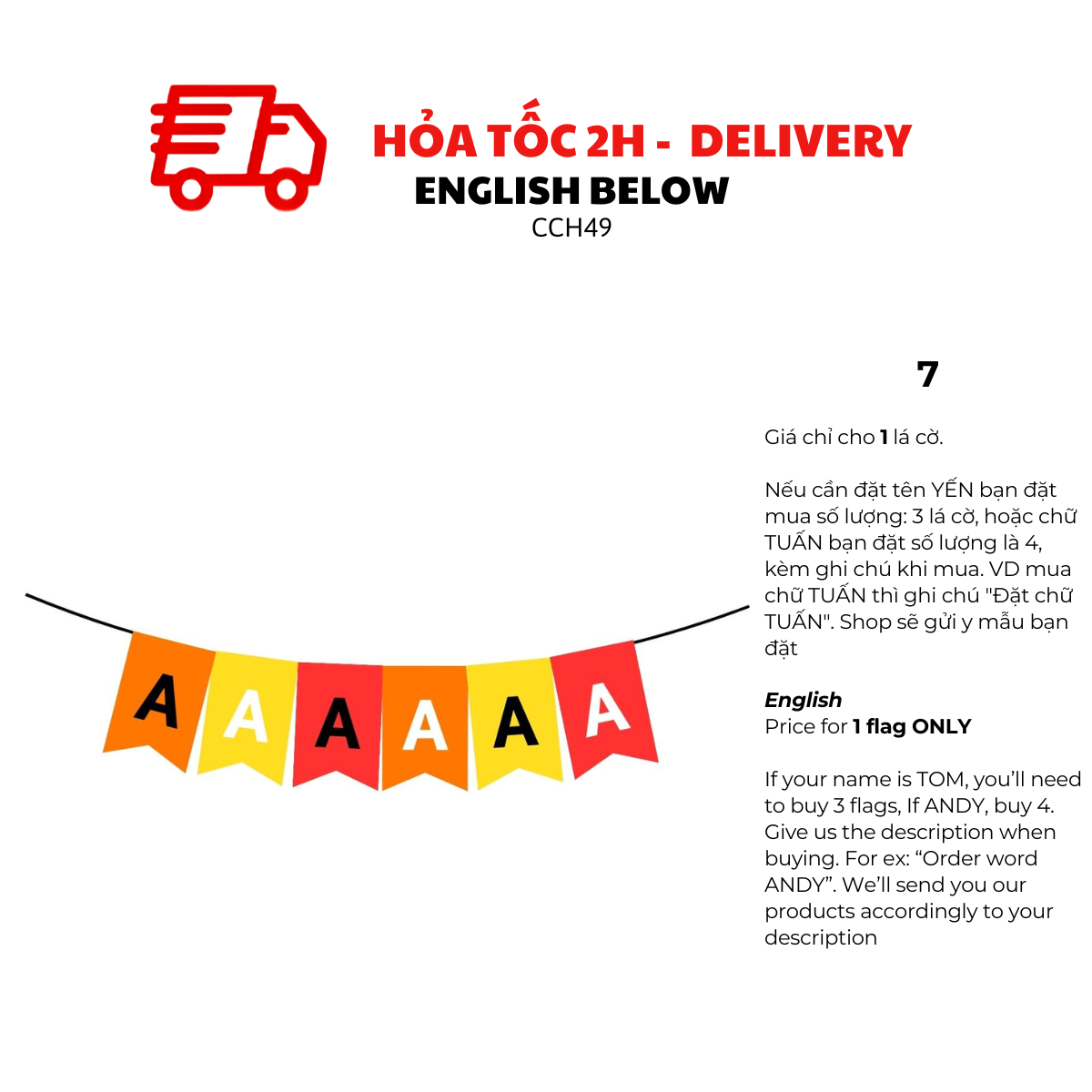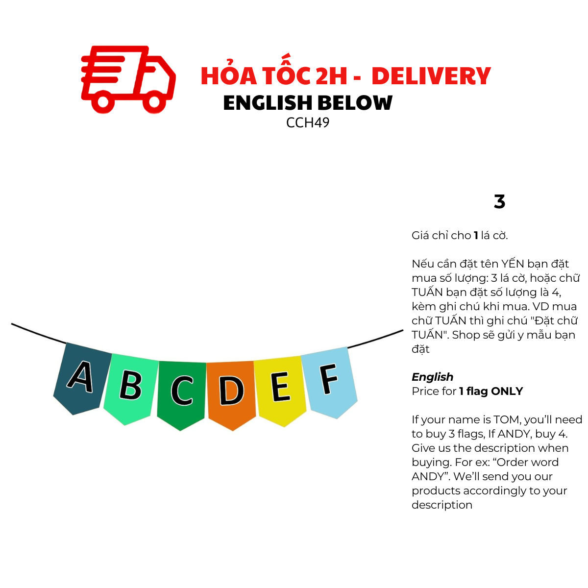 Cách đặt: Cần đặt tên YẾN bạn vui lòng đặt mua số lượng: 3 lá cờ hoặc chữ TUẤN bạn vui lòng đặt số lượng là 4, kèm ghi chú khi mua. VD mua chữ TUẤN thì ghi chú "Đặt chữ TUẤN". Shop sẽ gửi y mẫu bạn đặt