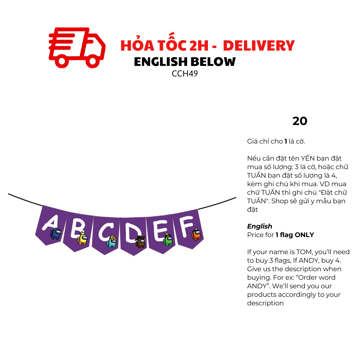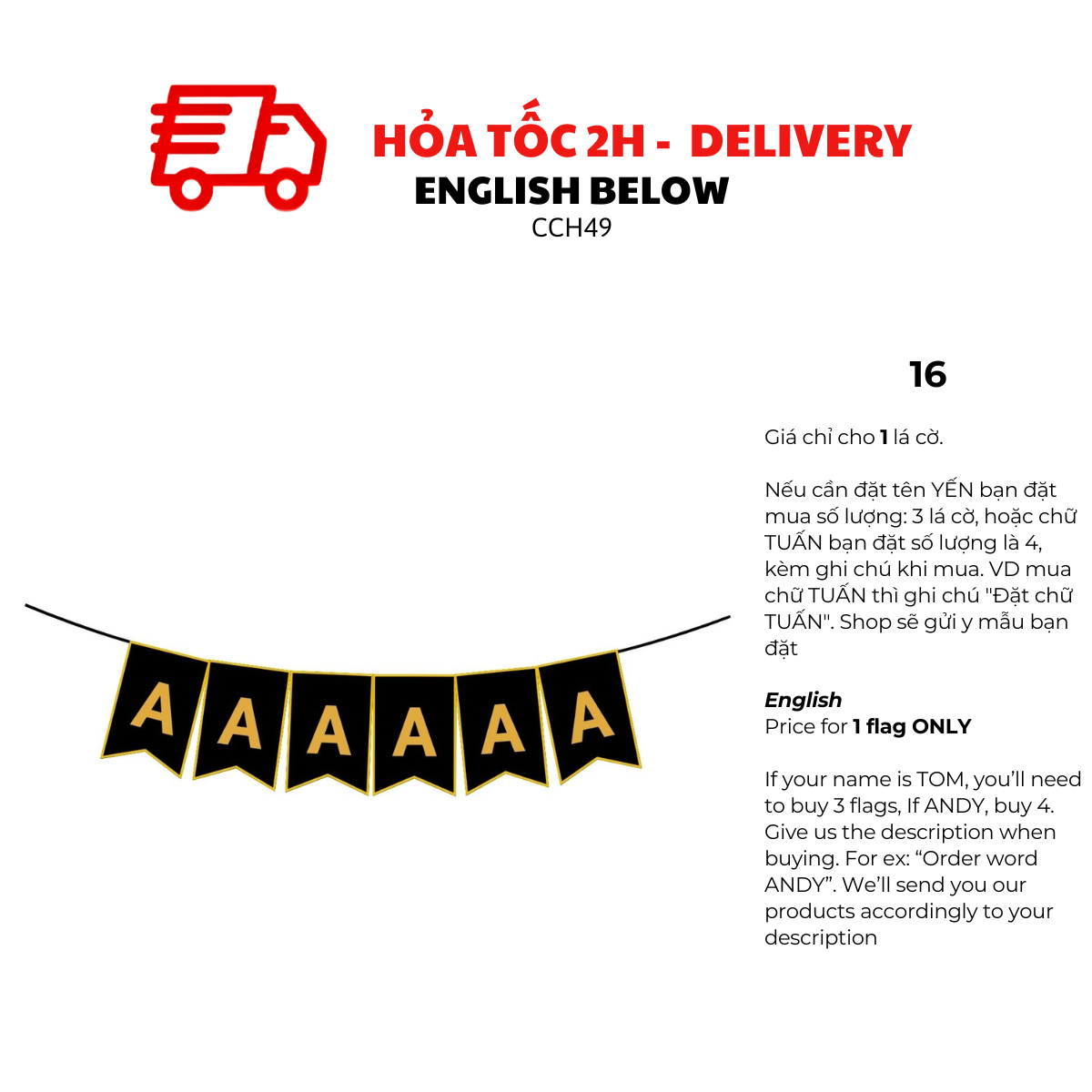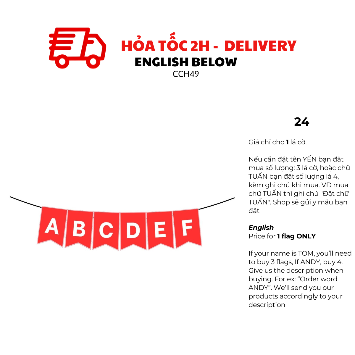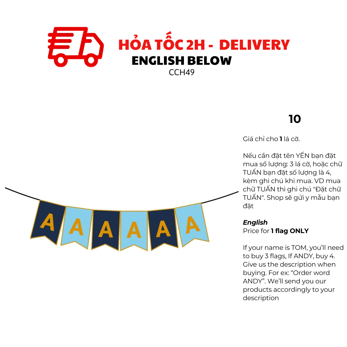 Cách đặt: Cần đặt tên YẾN bạn vui lòng đặt mua số lượng: 3 lá cờ hoặc chữ TUẤN bạn vui lòng đặt số lượng là 4, kèm ghi chú khi mua. VD mua chữ TUẤN thì ghi chú "Đặt chữ TUẤN". Shop sẽ gửi y mẫu bạn đặt