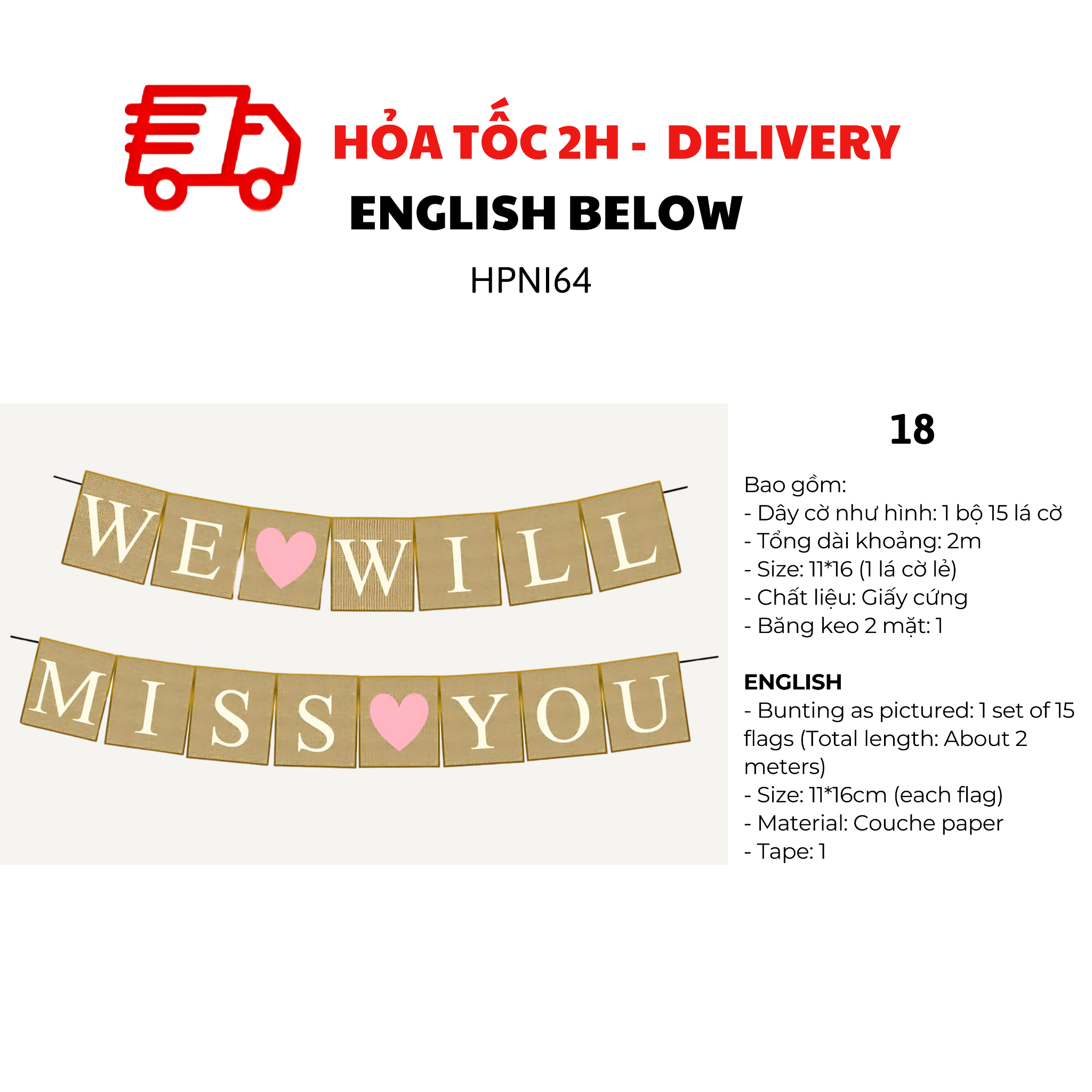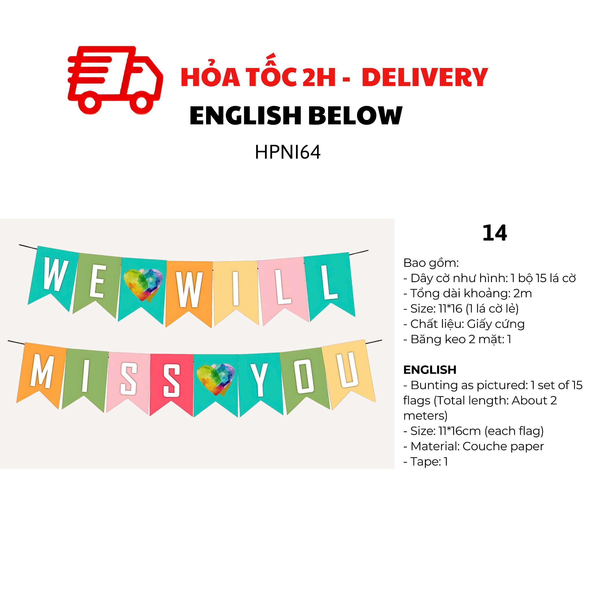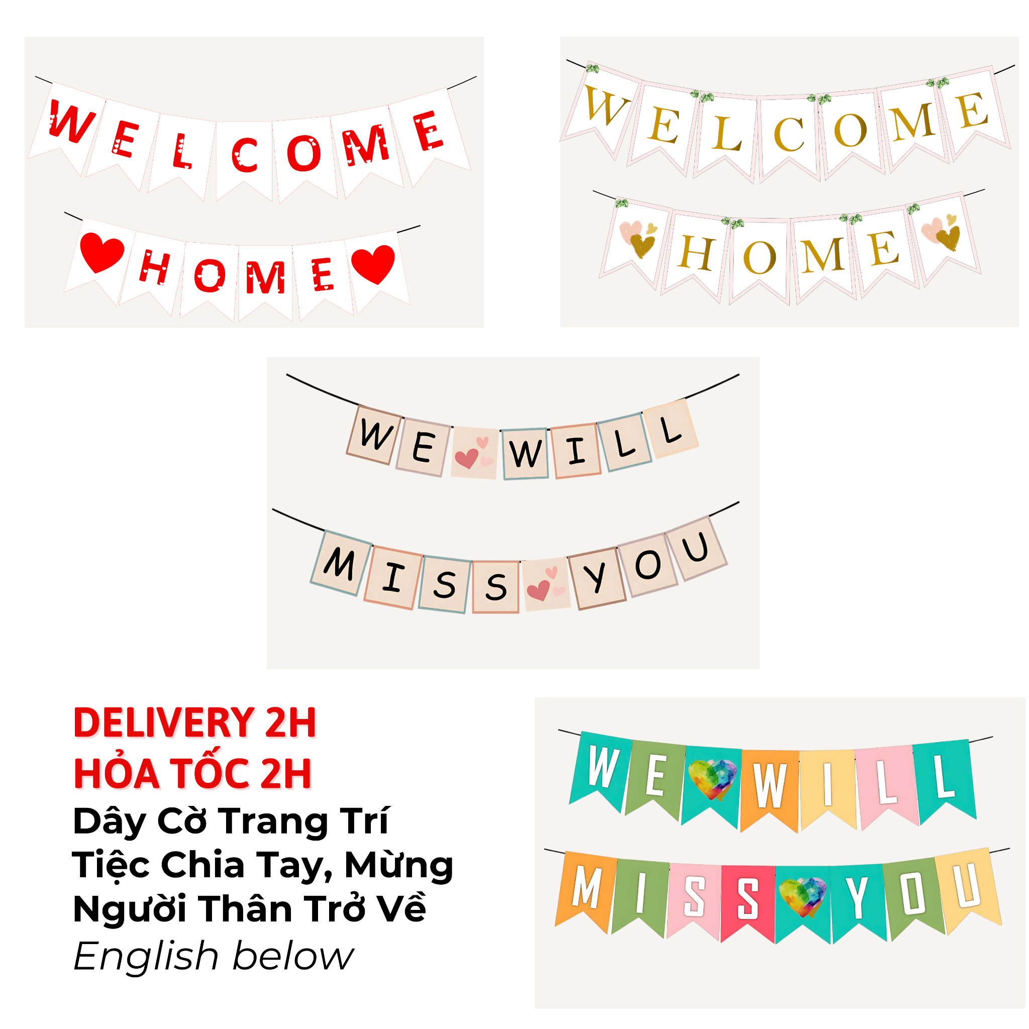 Mang đến không gian trang trí sang trọng và ý nghĩa với dây cờ "Welcome Home" & "We Will Miss You" – phụ kiện không thể thiếu cho tiệc chào đón người thân trở về hoặc tiệc chia tay đồng nghiệp, giáo viên, học sinh.