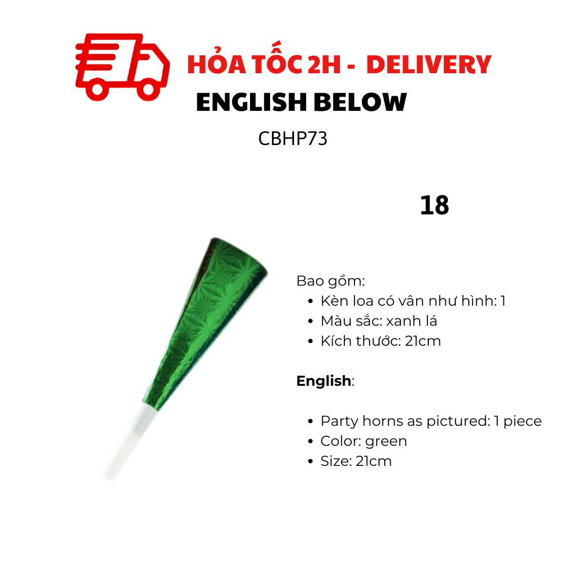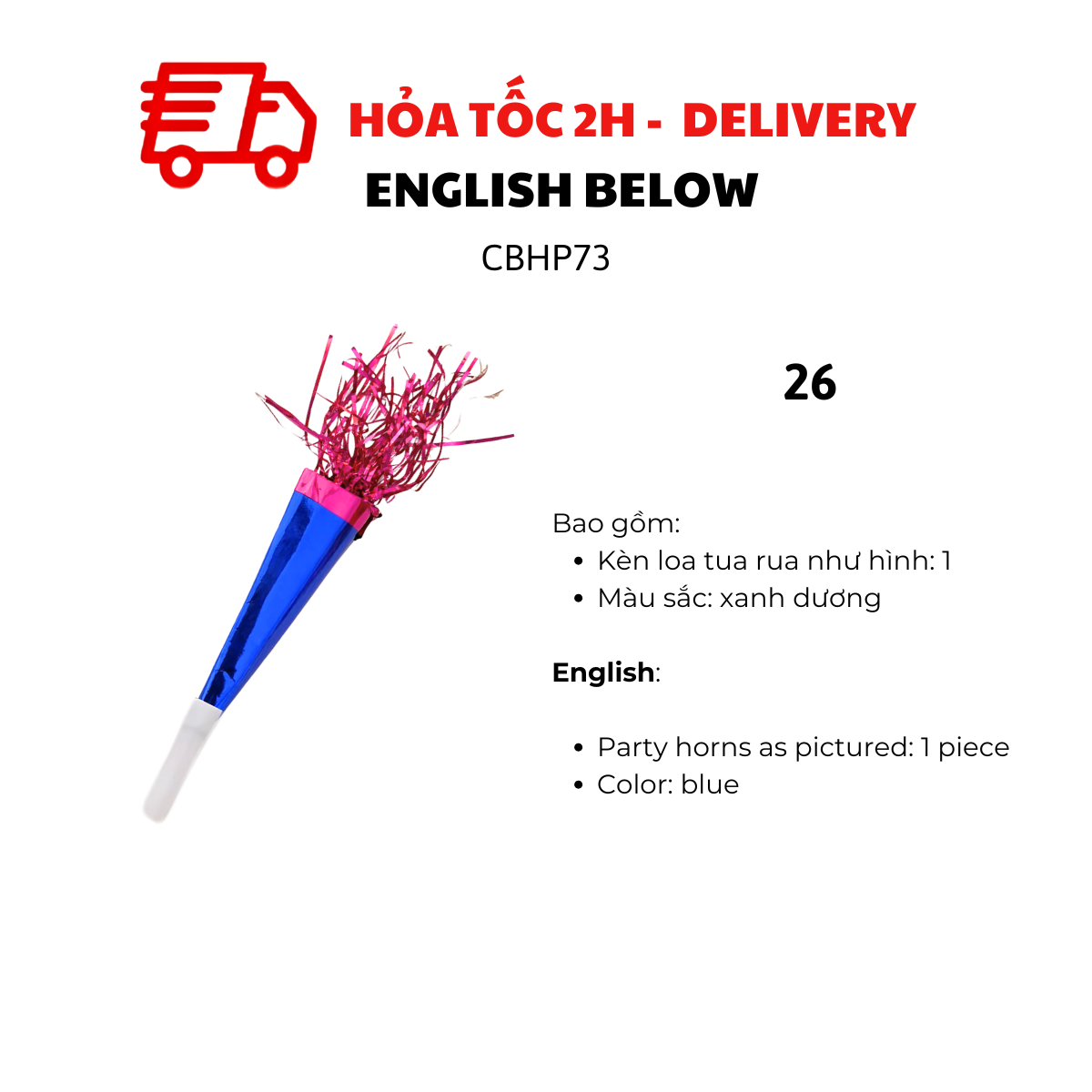 - Party horns as pictured: 1 piece