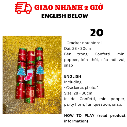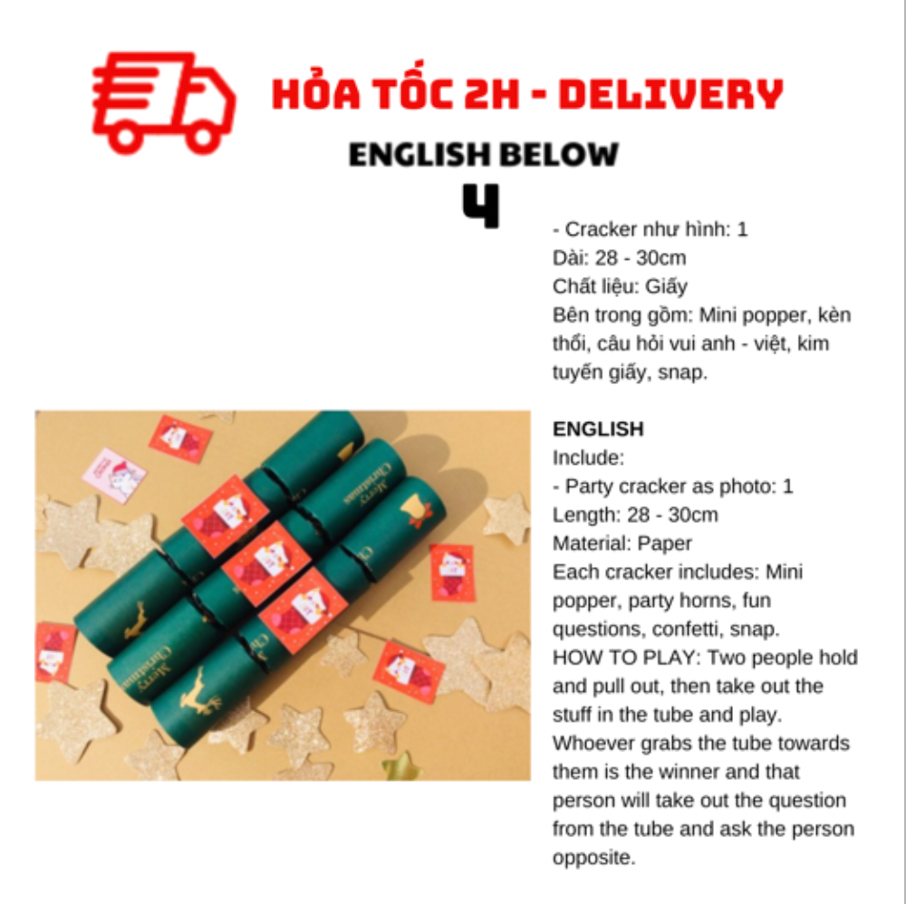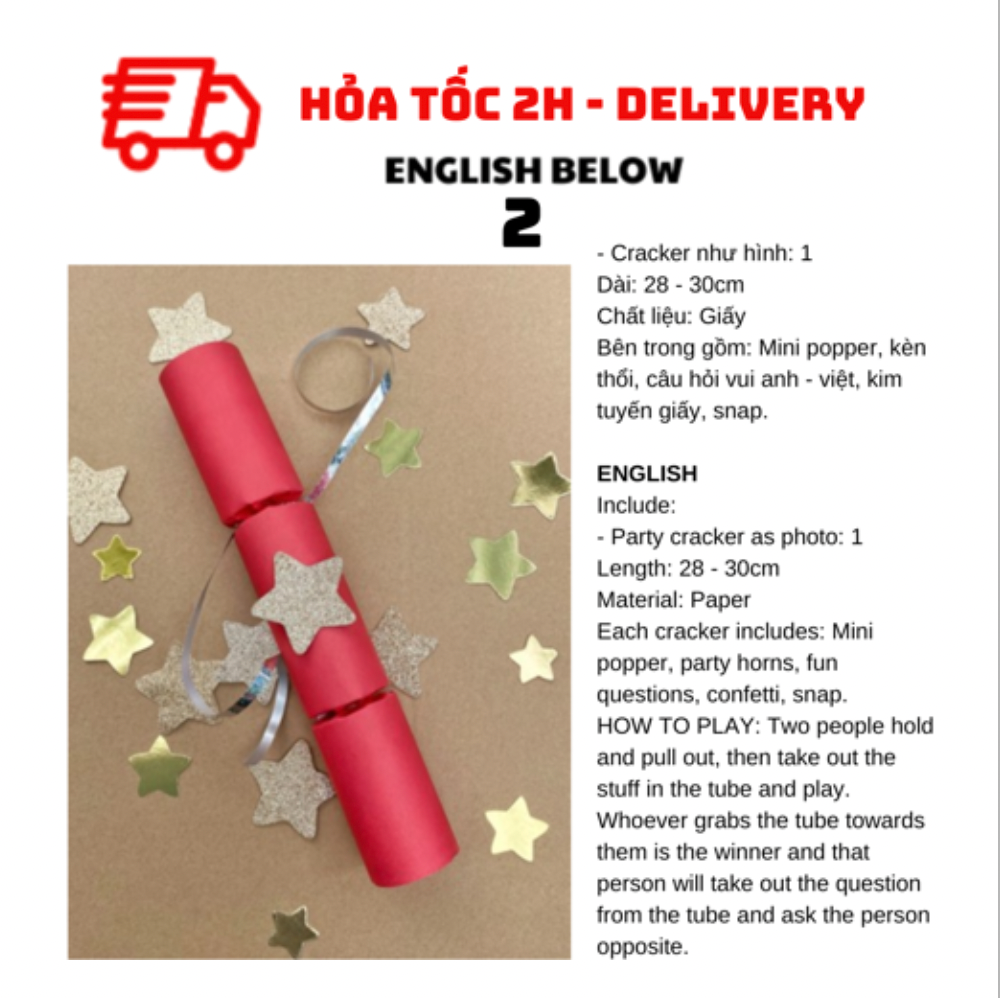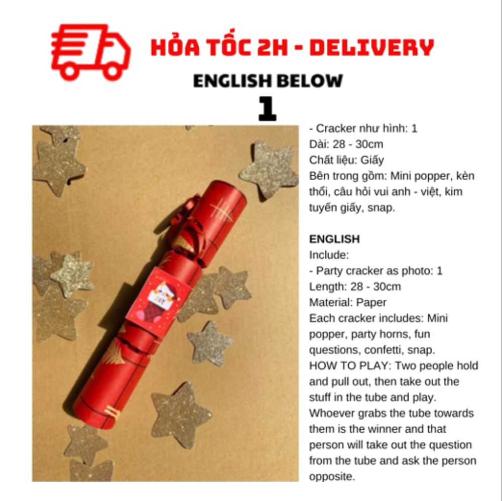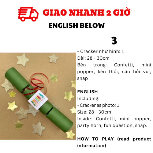 CÁCH CHƠI CRACKERS: Hai người cầm và kéo ra trong bữa tiệc, rồi lấy đồ trong ống giấy ra và chơi. Ai giật được phần ống về phía mình mặc định là người thắng và người đó sẽ lấy câu hỏi trong ống ra và hỏi người đối diện.
