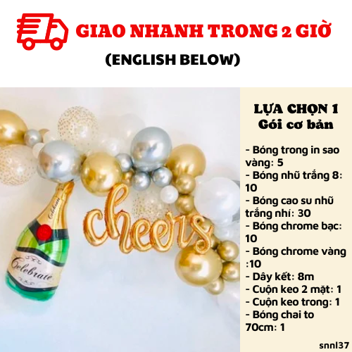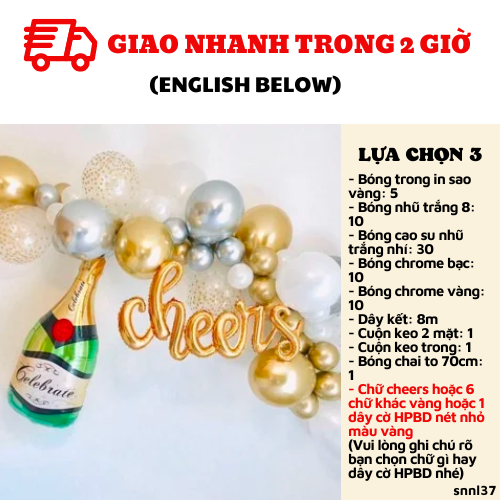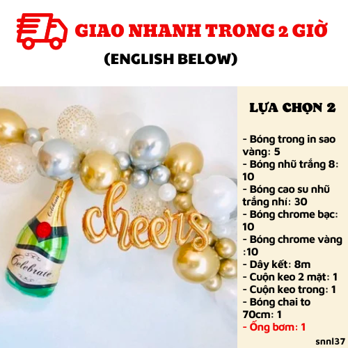 Bao gồm: Kết đủ 1.5-2m bóng- Bóng trong in sao vàng: 5+ 10 bóng nhũ trắng 8+ 30 bóng cao su nhũ trắng nhí- 10 bóng chrome bạc+ 10 bóng chrome vàng- 8m dây kết+1 cuộn keo 2 mặt+ 1 cuộn keo trong- 1 chai to 70cmLỰA CHỌN 2: BAO GỒM LỰA CHỌN 1 + ỐNG BƠMCombo có giá: 404KNay chỉ còn: 234KBao gồm:- Bóng trong in sao vàng: 5+ 10 bóng nhũ trắng 8+ 30 bóng cao su nhũ trắng nhí- 10 bóng chrome bạc+ 10 bóng chrome vàng- 8m dây kết+1 cuộn keo 2 mặt+ 1 cuộn keo trong- 1 chai to 70cm- Ống bơm: 1LỰA CHỌN 3: BAO GỒM LỰA CHỌN 1+ CHỮ CHEERS HOẶC HPBDCombo có giá: 479KNay chỉ còn: 299KBao gồm:- Bóng trong in sao vàng: 5+ 10 bóng nhũ trắng 8+ 30 bóng cao su nhũ trắng nhí- 10 bóng chrome bạc+ 10 bóng chrome vàng- 8m dây kết+1 cuộn keo 2 mặt+ 1 cuộn keo trong- 1 chai to 70cm- Chữ cheers hoặc 6 chữ khác vàng hoặc 1 dây cờ HPBD nét nhỏ màu vàngvui lòng ghi chú rõ bạn chọn chữ gì hay dây cờ HPBD nhé