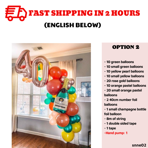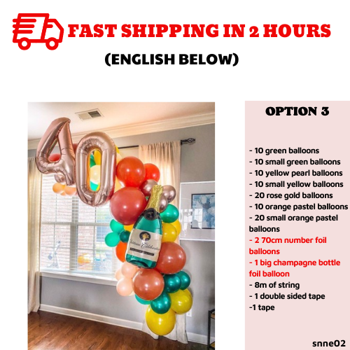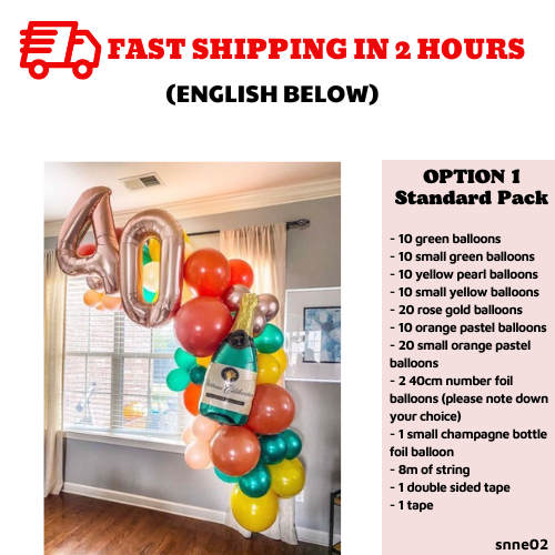 Include:- 10 green balloons- 10 small green balloons- 10 yellow pearl balloons- 10 small yellow balloons- 20 rose gold balloons- 10 orange pastel balloons- 20 small orange pastel balloons- 2 40cm number foil balloons (please note down your choice)- 1 small champagne bottle foil balloon- 8m of string- 1 double sided tape- 1 tape