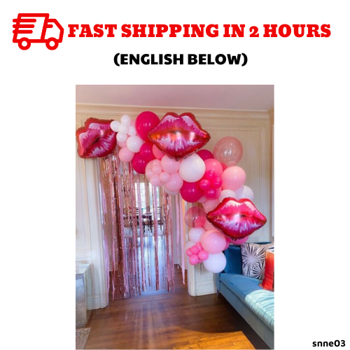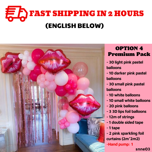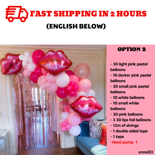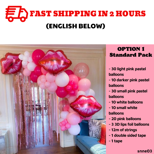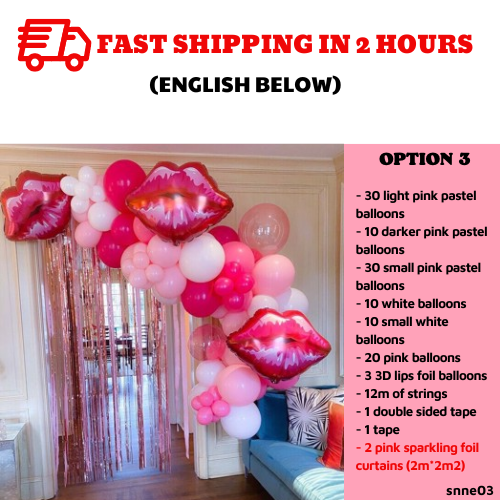 Include:- 30 light pink pastel balloons- 10 darker pink pastel balloons- 30 small pink pastel balloons- 10 white balloons- 10 small white balloons- 20 pink balloons- 3 3D lips foil balloons- 12m of strings- 1 double sided tape- 1 tape- 2 pink sparkling foil curtains (2m*2m2)