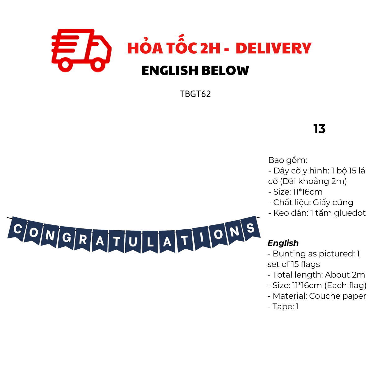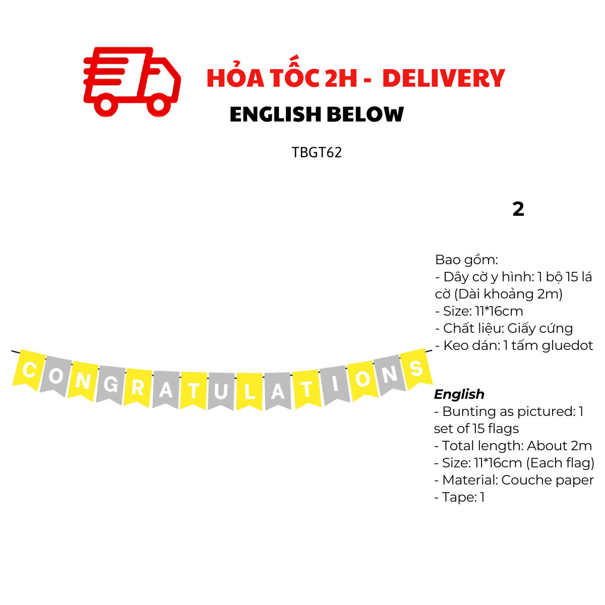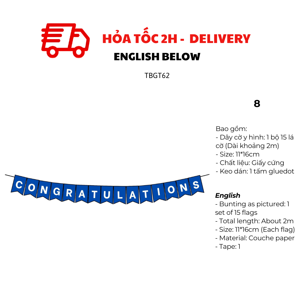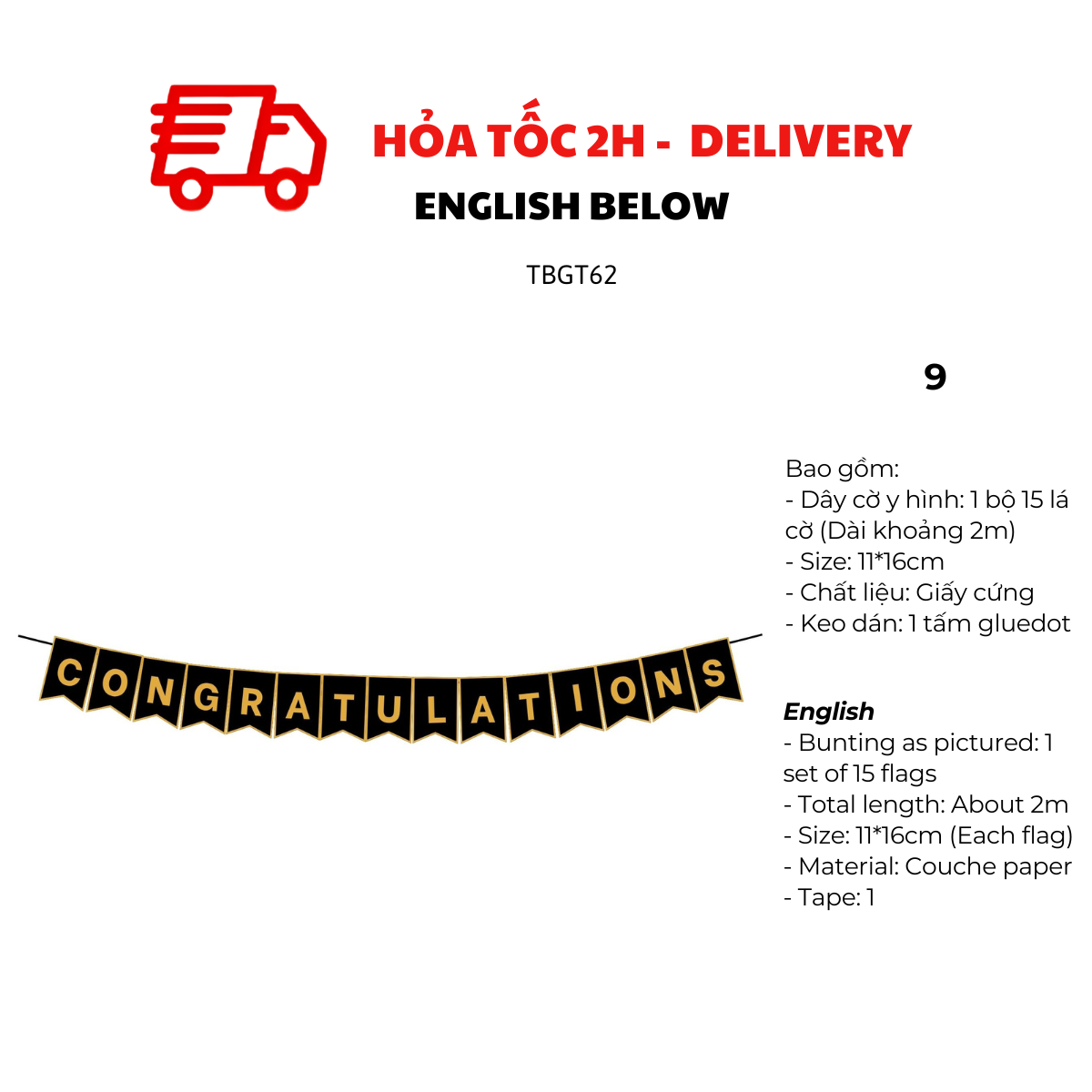 Tô điểm không gian buổi tiệc với Dây Cờ CONGRATULATIONS – món phụ kiện trang trí tuyệt vời cho các dịp đặc biệt như lễ tốt nghiệp, tiệc chúc mừng, khai trương hoặc sinh nhật. Với phông chữ nổi bật, màu sắc tươi sáng và thiết kế sang trọng, dây cờ giúp tạo điểm nhấn thu hút và lan tỏa không khí vui tươi trong buổi lễ.