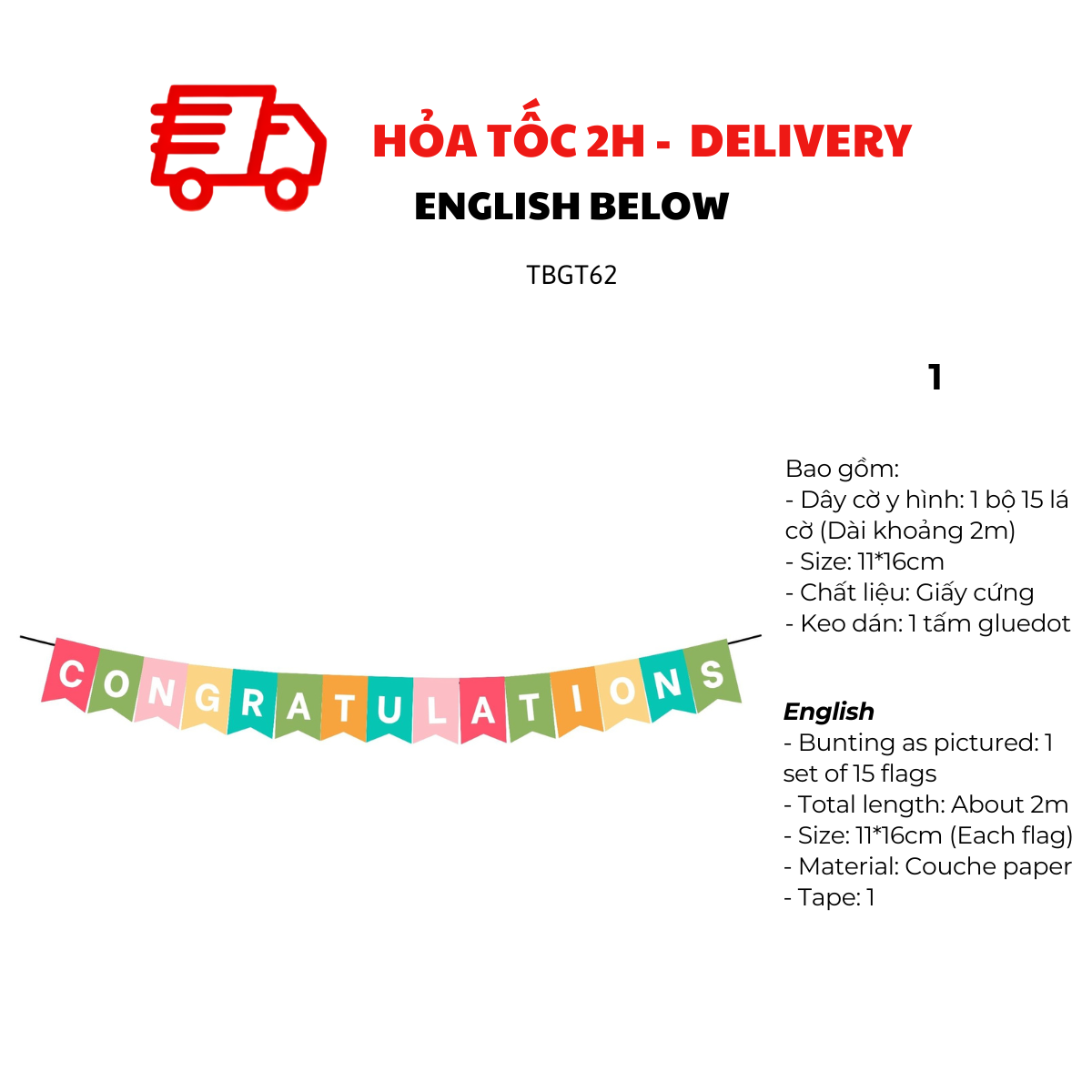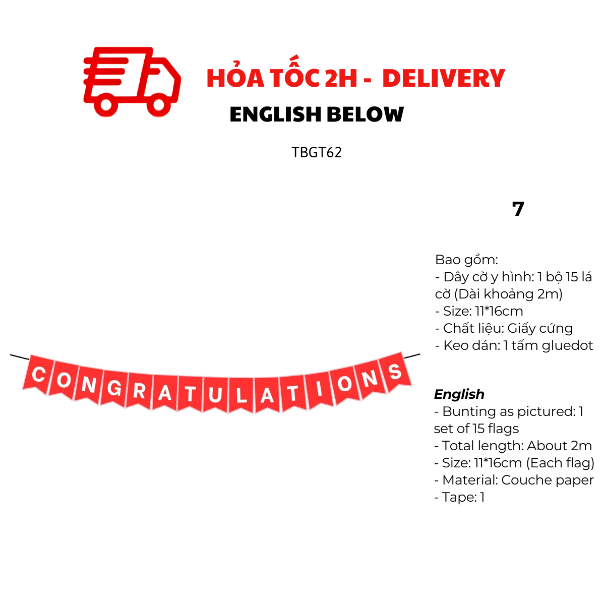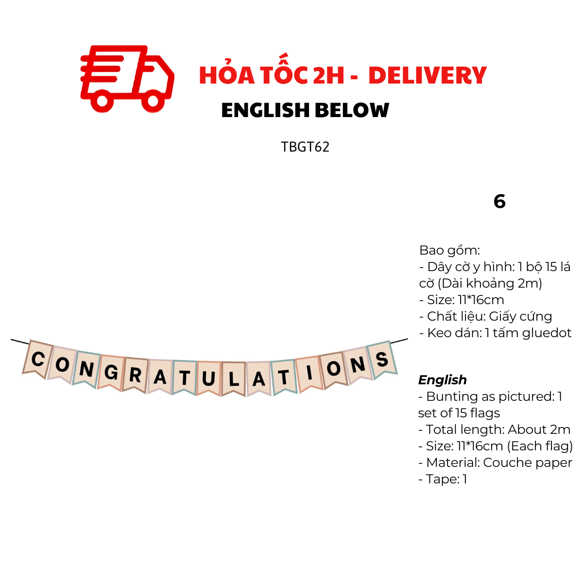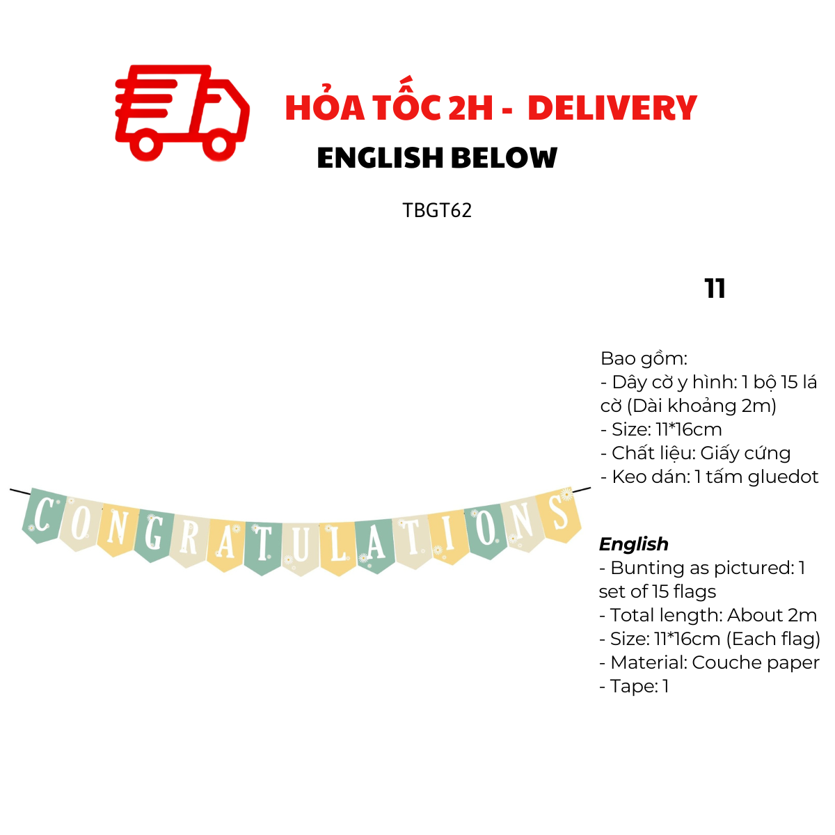 Tô điểm không gian buổi tiệc với Dây Cờ CONGRATULATIONS – món phụ kiện trang trí tuyệt vời cho các dịp đặc biệt như lễ tốt nghiệp, tiệc chúc mừng, khai trương hoặc sinh nhật. Với phông chữ nổi bật, màu sắc tươi sáng và thiết kế sang trọng, dây cờ giúp tạo điểm nhấn thu hút và lan tỏa không khí vui tươi trong buổi lễ.