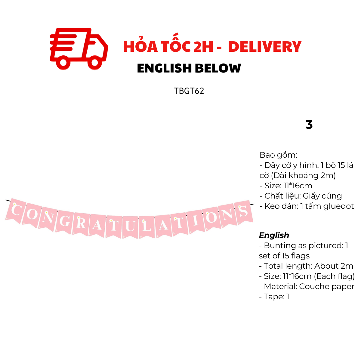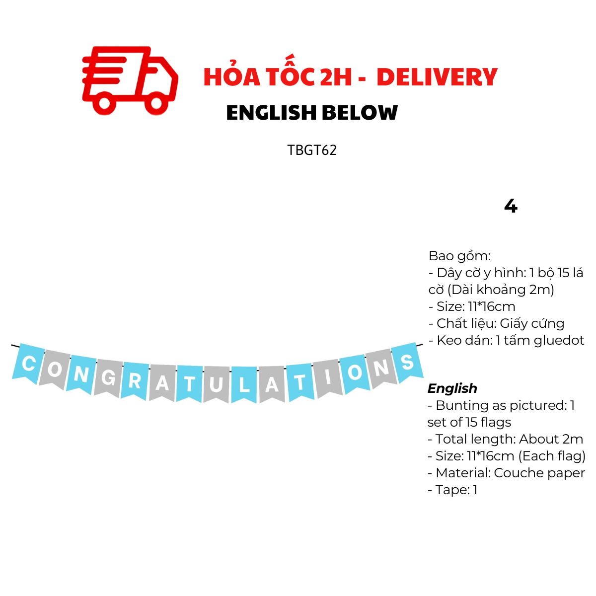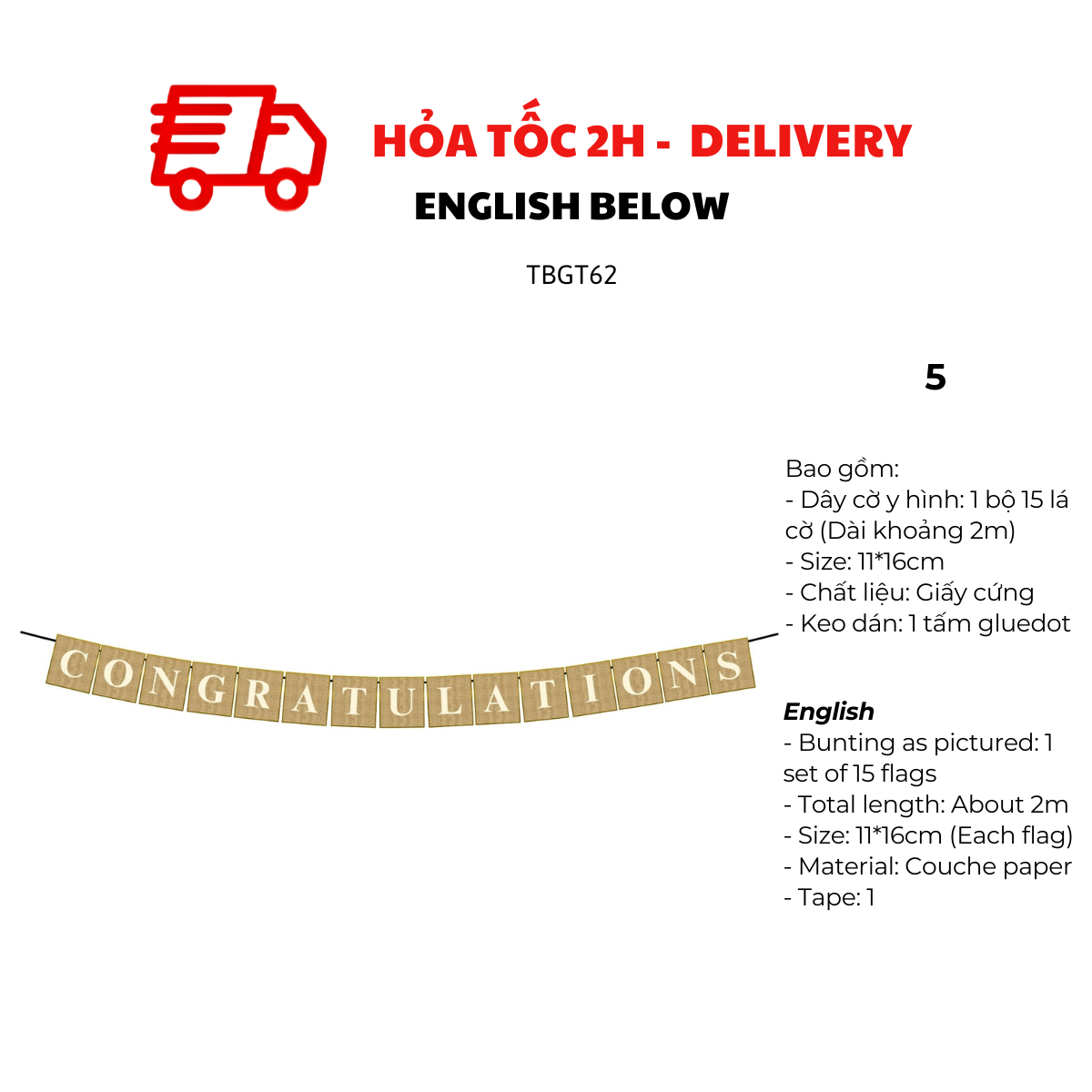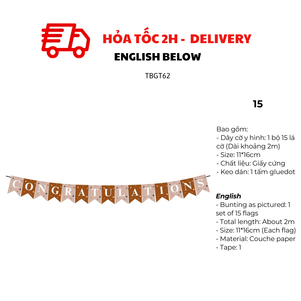 Tô điểm không gian buổi tiệc với Dây Cờ CONGRATULATIONS – món phụ kiện trang trí tuyệt vời cho các dịp đặc biệt như lễ tốt nghiệp, tiệc chúc mừng, khai trương hoặc sinh nhật. Với phông chữ nổi bật, màu sắc tươi sáng và thiết kế sang trọng, dây cờ giúp tạo điểm nhấn thu hút và lan tỏa không khí vui tươi trong buổi lễ.