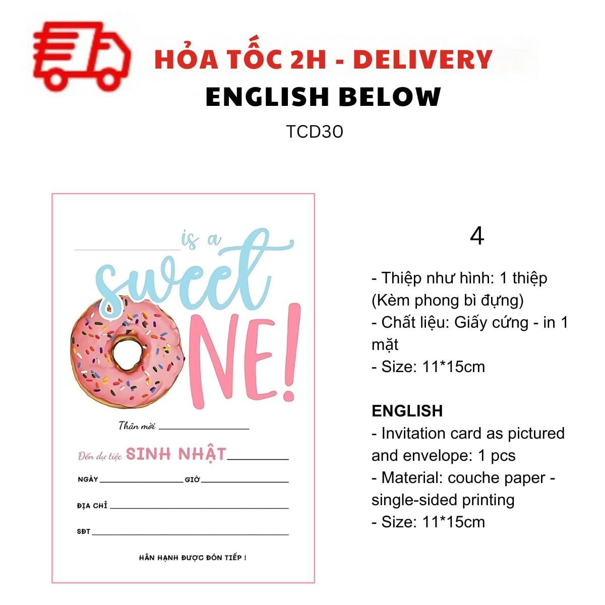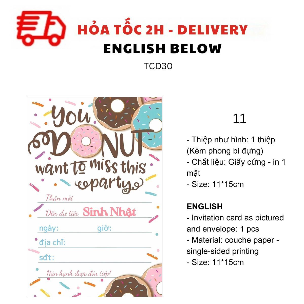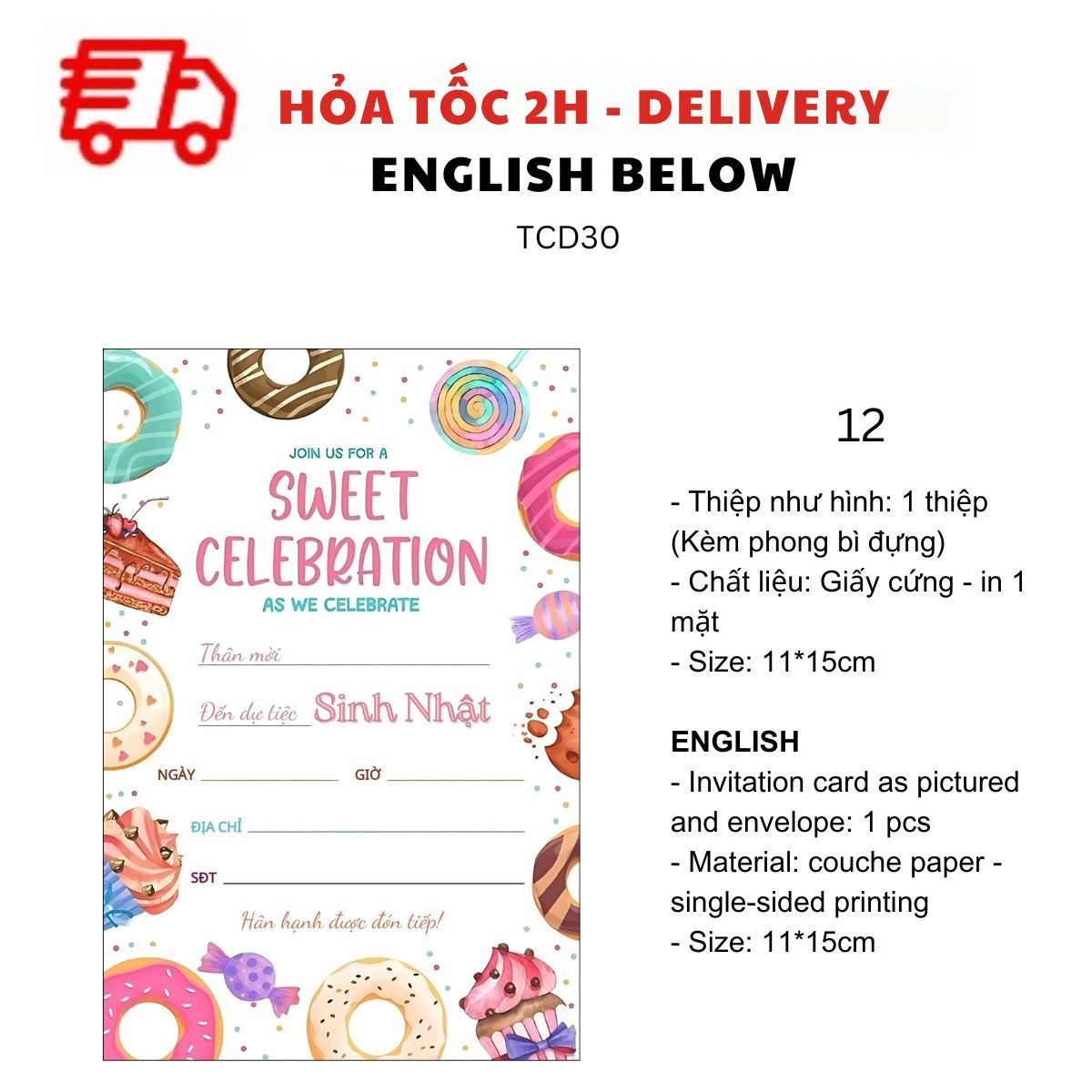THIỆP MỜI SINH NHẬT CHỦ ĐỀ BÁNH DONUT, BÁNH NGỌT, TRÁI CÂY NHIỀU MẪU TIẾNG VIỆT TCD30