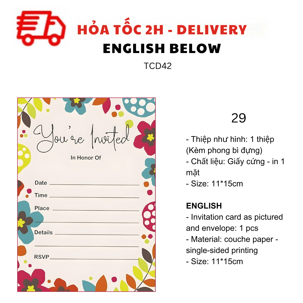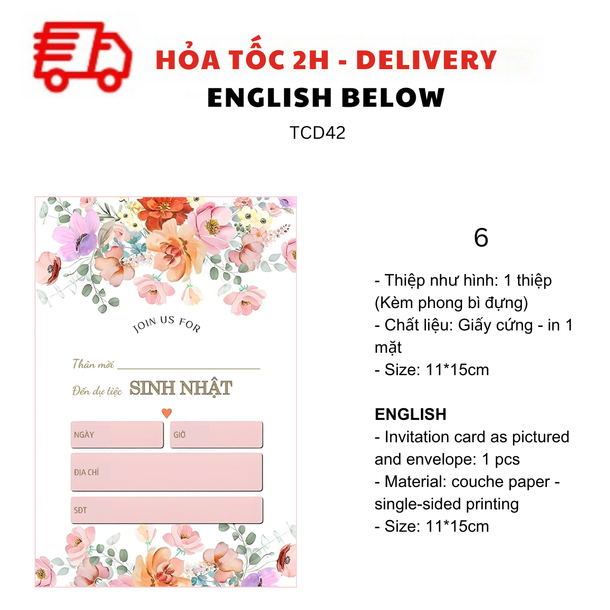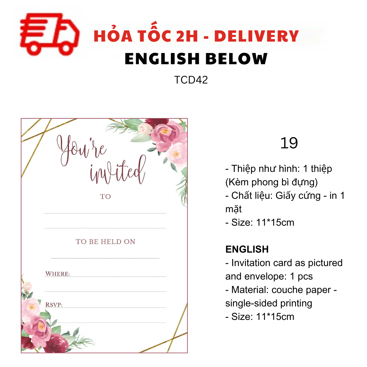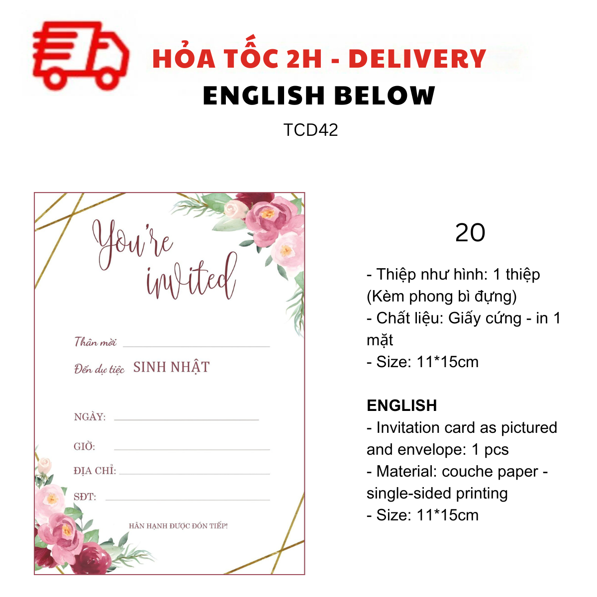 - Thiệp như hình: 1 thiệp (kèm Phong bì đựng)