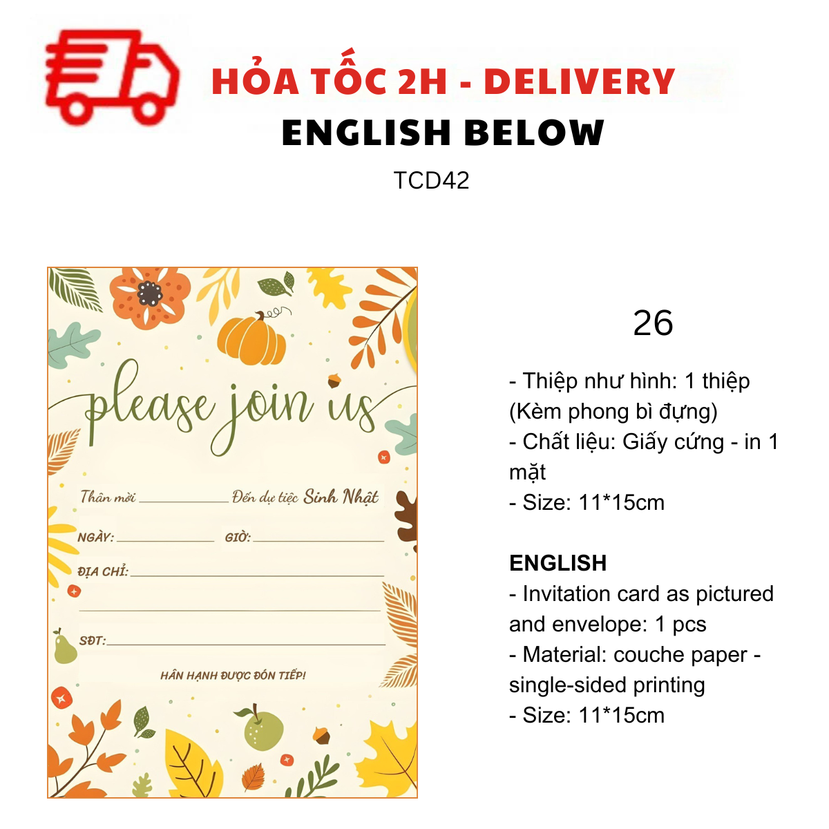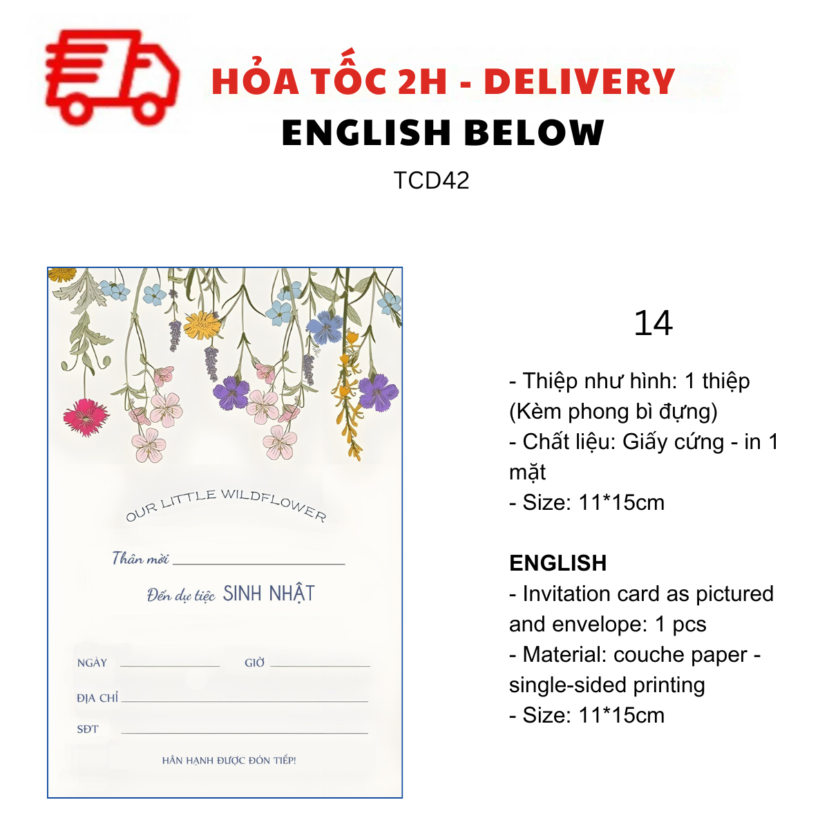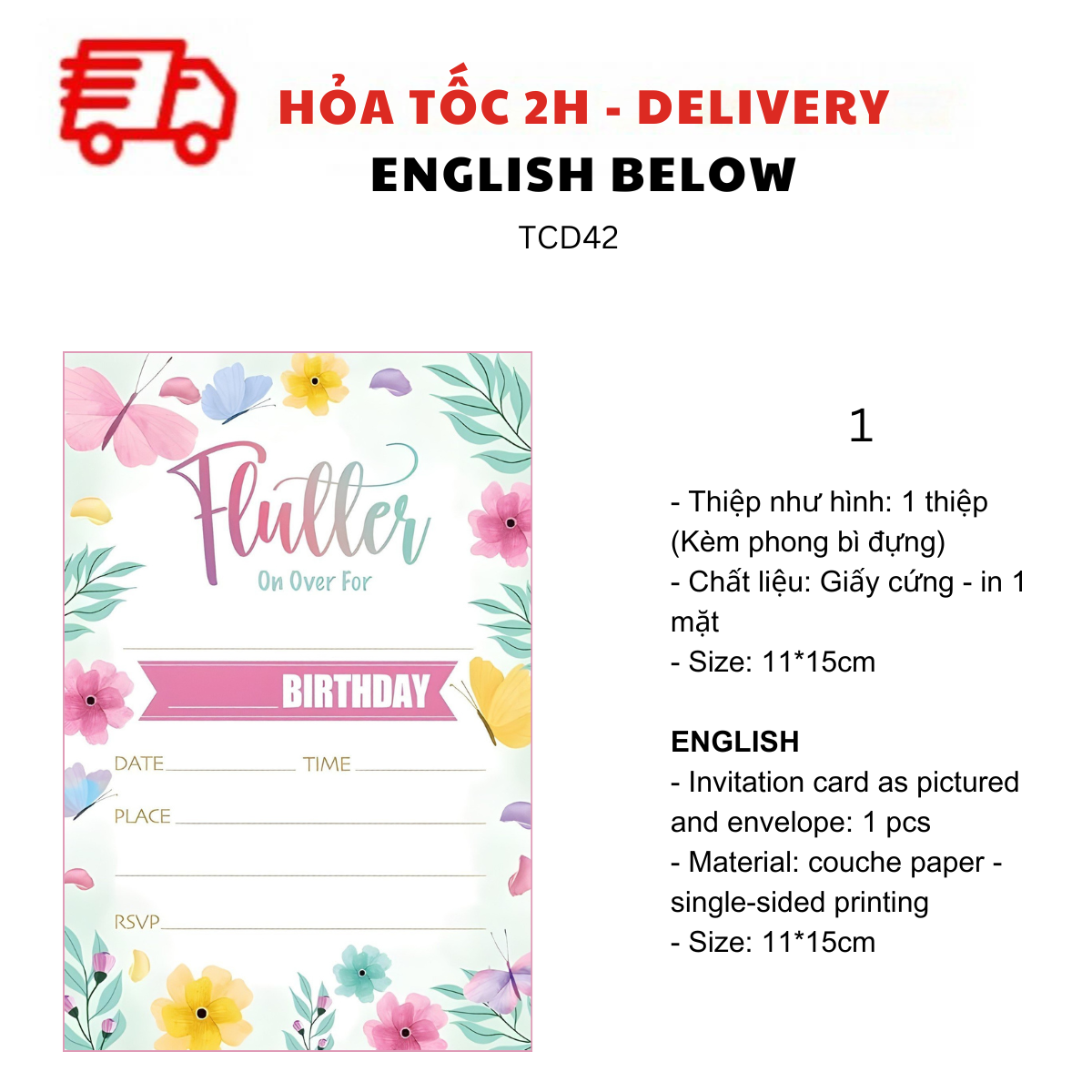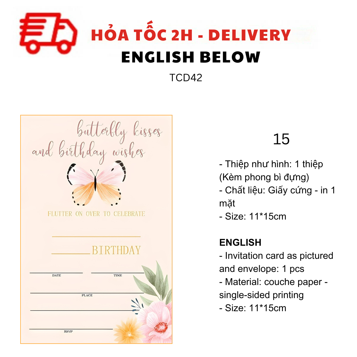 - Thiệp như hình: 1 thiệp (kèm Phong bì đựng)